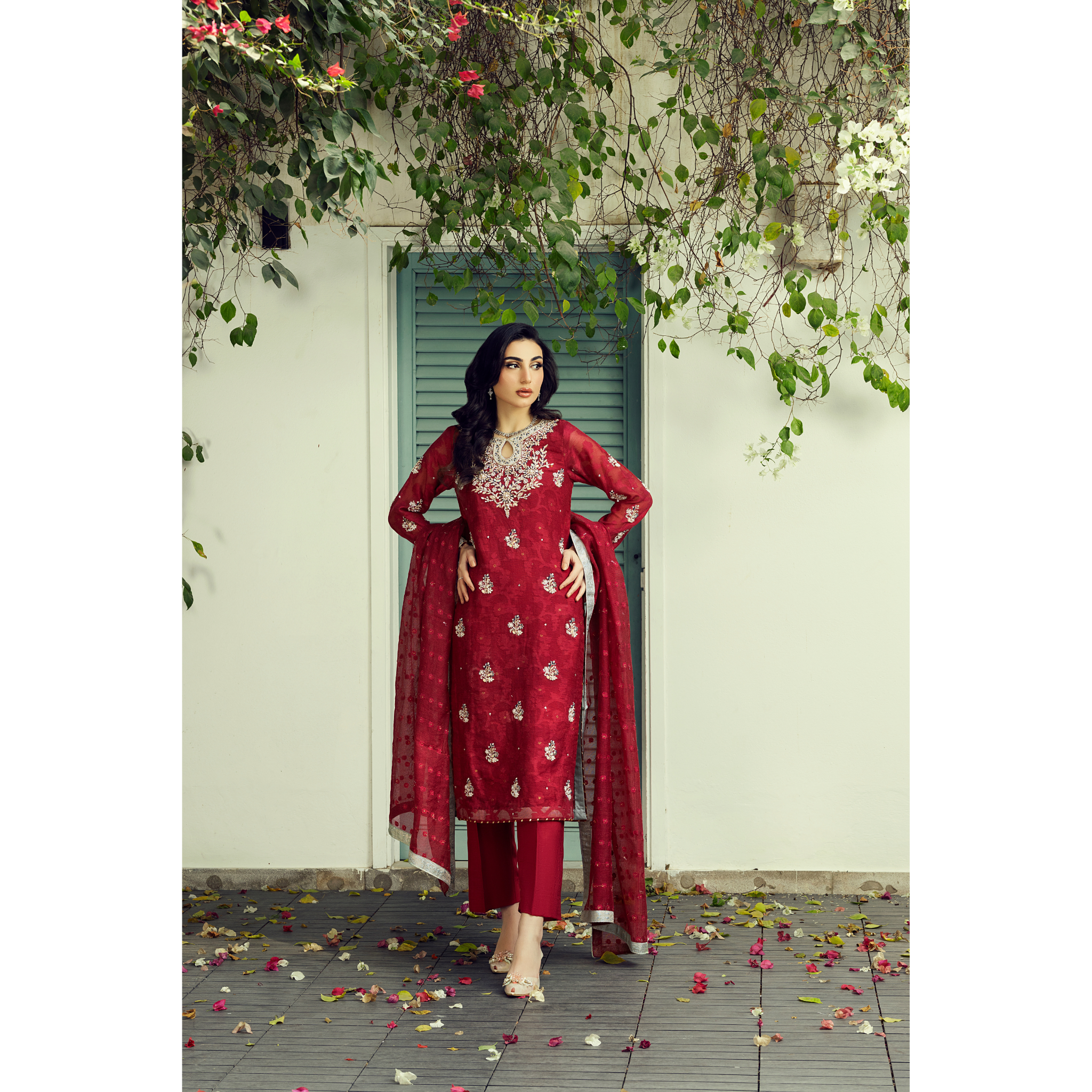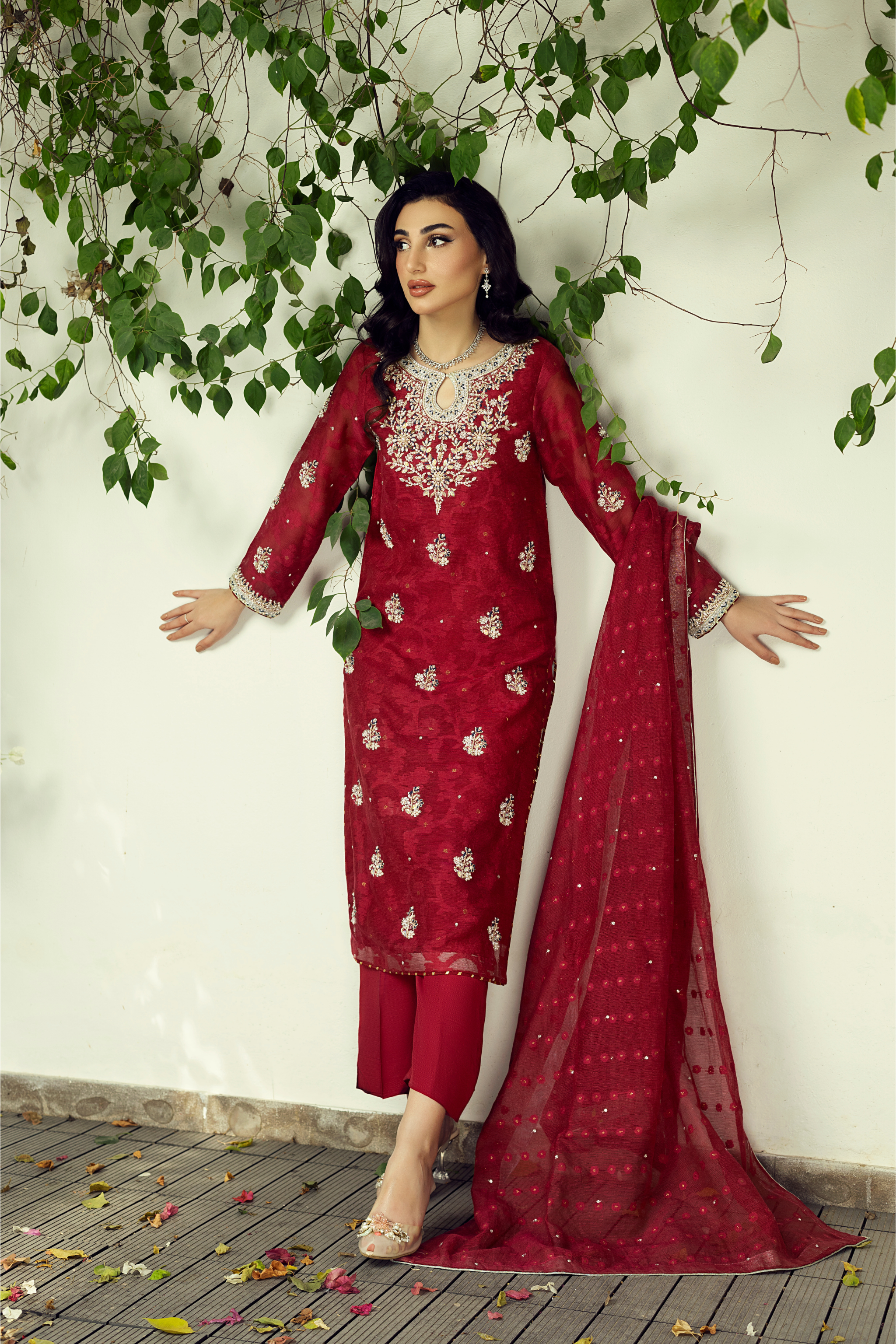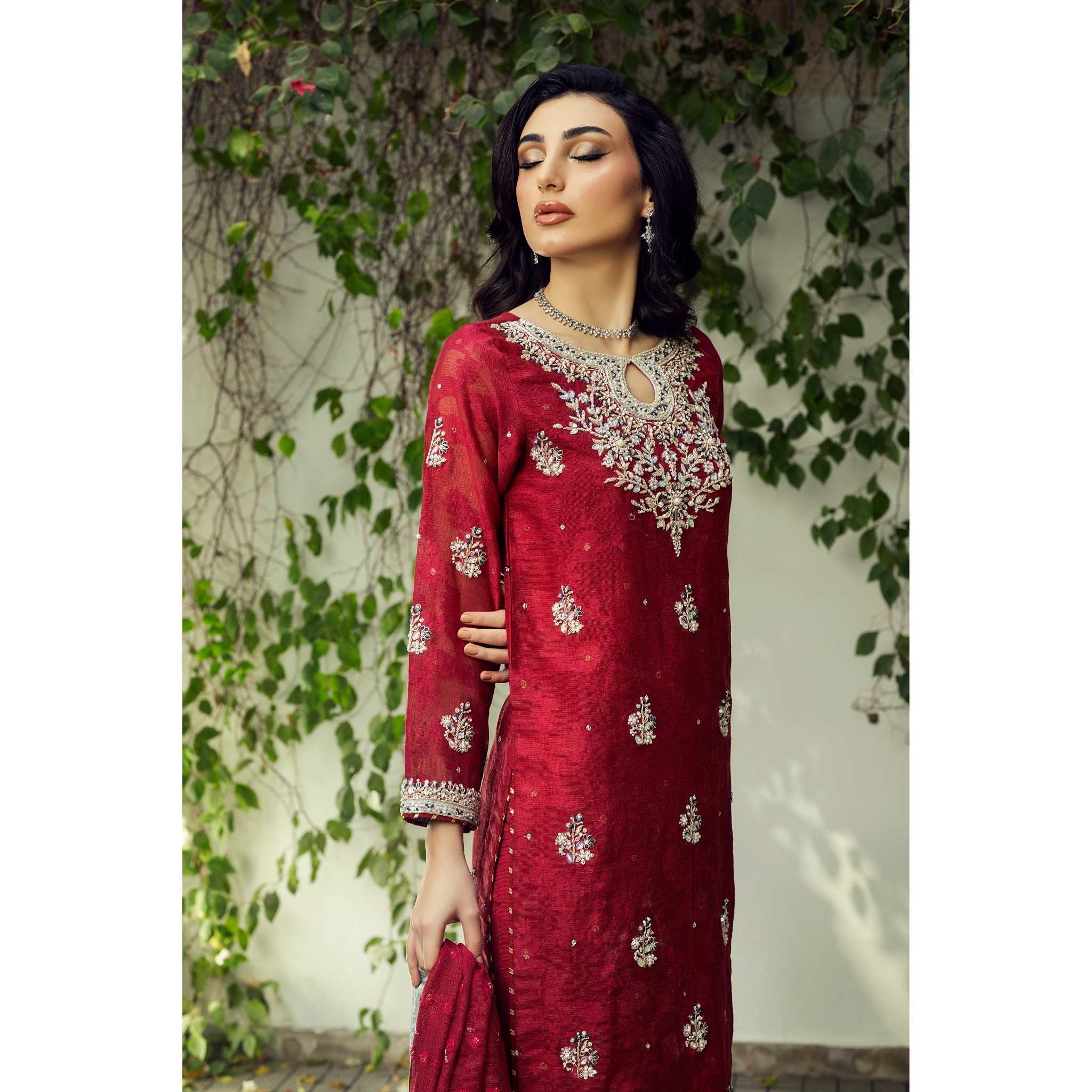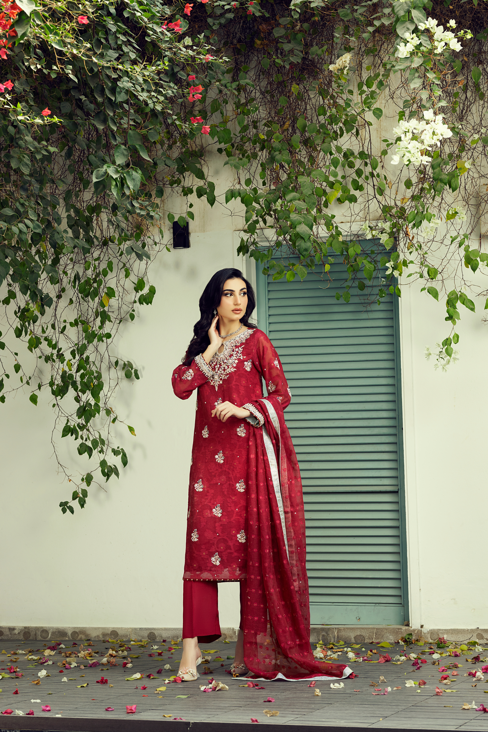 This stunning three-piece suit showcases the timeless allure of self khaddi net fabric, radiating grace and elegance. The straight red shirt is lavishly embellished with exquisite detailings of kora dabka, pearls, and motifs, which adds a regal charm. Complementing the shirt are tailored trousers that enhance its classic appeal. Completing the set is a beautifully crafted khaddi net dupatta, which perfectly balancing the traditional craft. The vibrant red color elevates the ensemble, making it a perfect choice for festive occasions, weddings, or ethnic celebrations. This attire is designed to make a timeless influence.