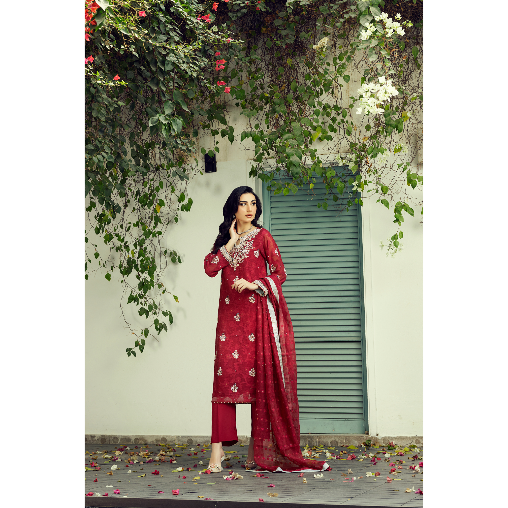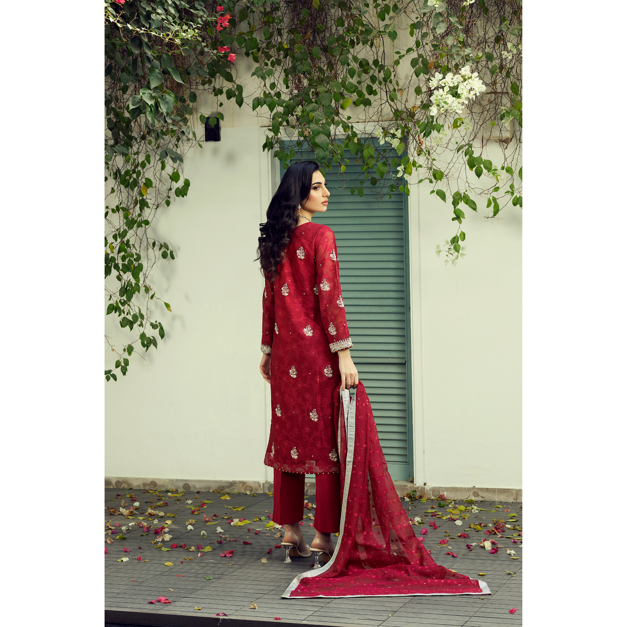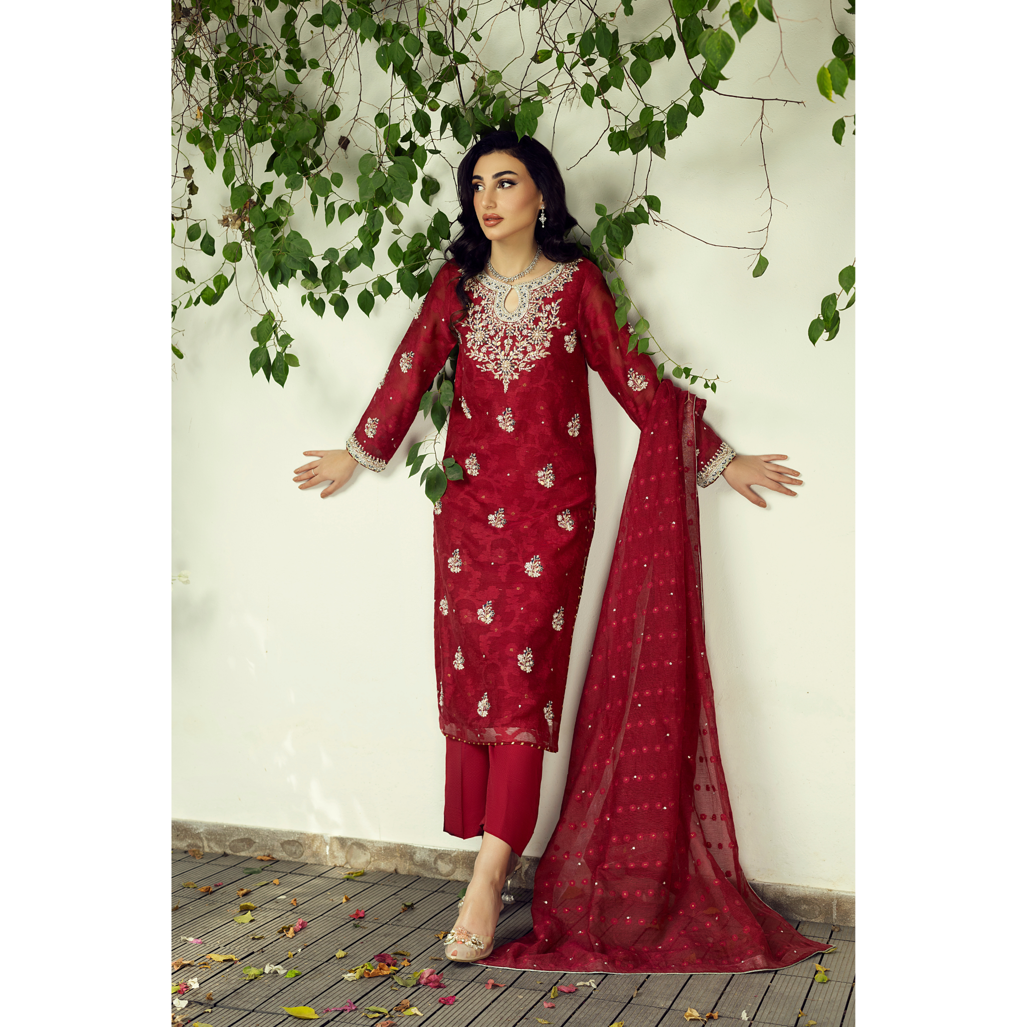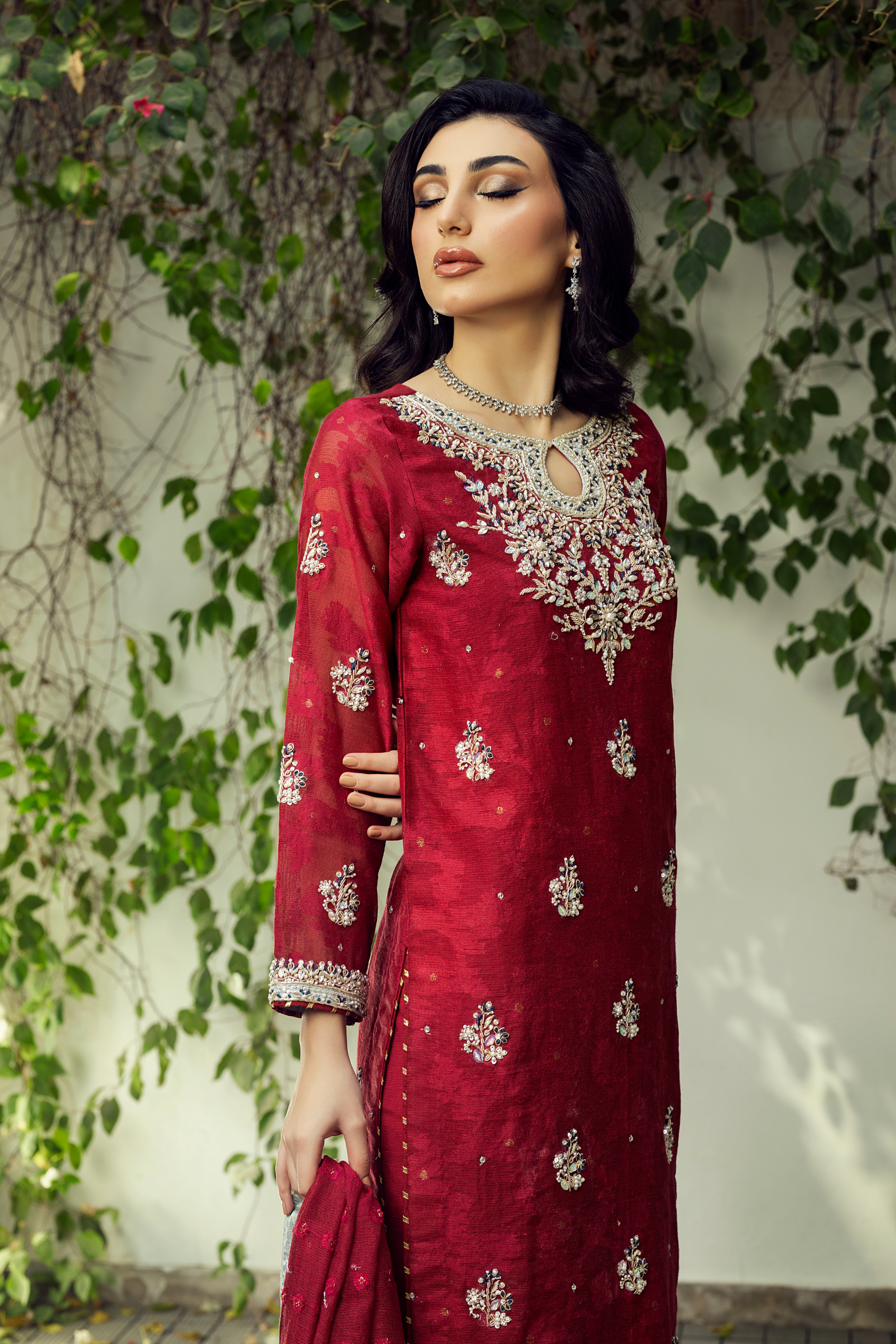 This stunning three-piece suit showcases the timeless allure of self khaddi net fabric, radiating grace and elegance. The straight red shirt is lavishly embellished with exquisite detailings of kora dabka, pearls, and motifs, which adds a regal charm. Complementing the shirt are tailored trousers that enhance its classic appeal. Completing the set is a beautifully crafted khaddi net dupatta, which perfectly balancing the traditional craft. The vibrant red color elevates the ensemble, making it a perfect choice for festive occasions, weddings, or ethnic celebrations. This attire is designed to make a timeless influence.