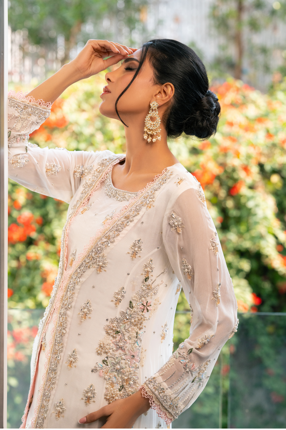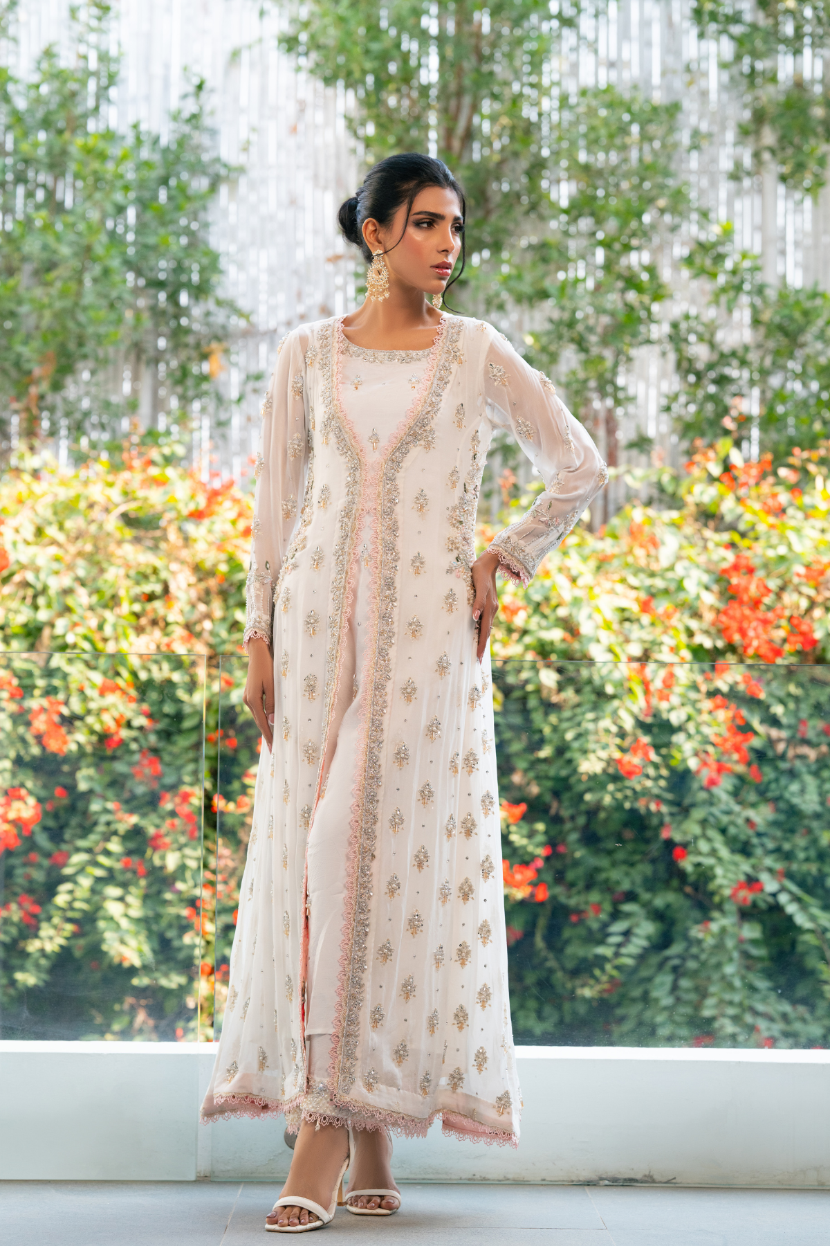 This sophisticated three-piece off-white suit is a statement of refined design and meticulous craftsmanship. Featuring a raw silk inner  shirt, a sheer extensively embellished chiffon upper with heavy embroidery & bunch of stones, and tailored raw silk trousers, the ensemble is elevated with rich detailing. The inner neckline showcases extensive handwork, while the trouser sides and hems are adorned with intricate embellishments, including stones, motifs, pearls. Finished with delicate metallic pink thread accents, the design reflects superior quality, elegance, and modern luxury.