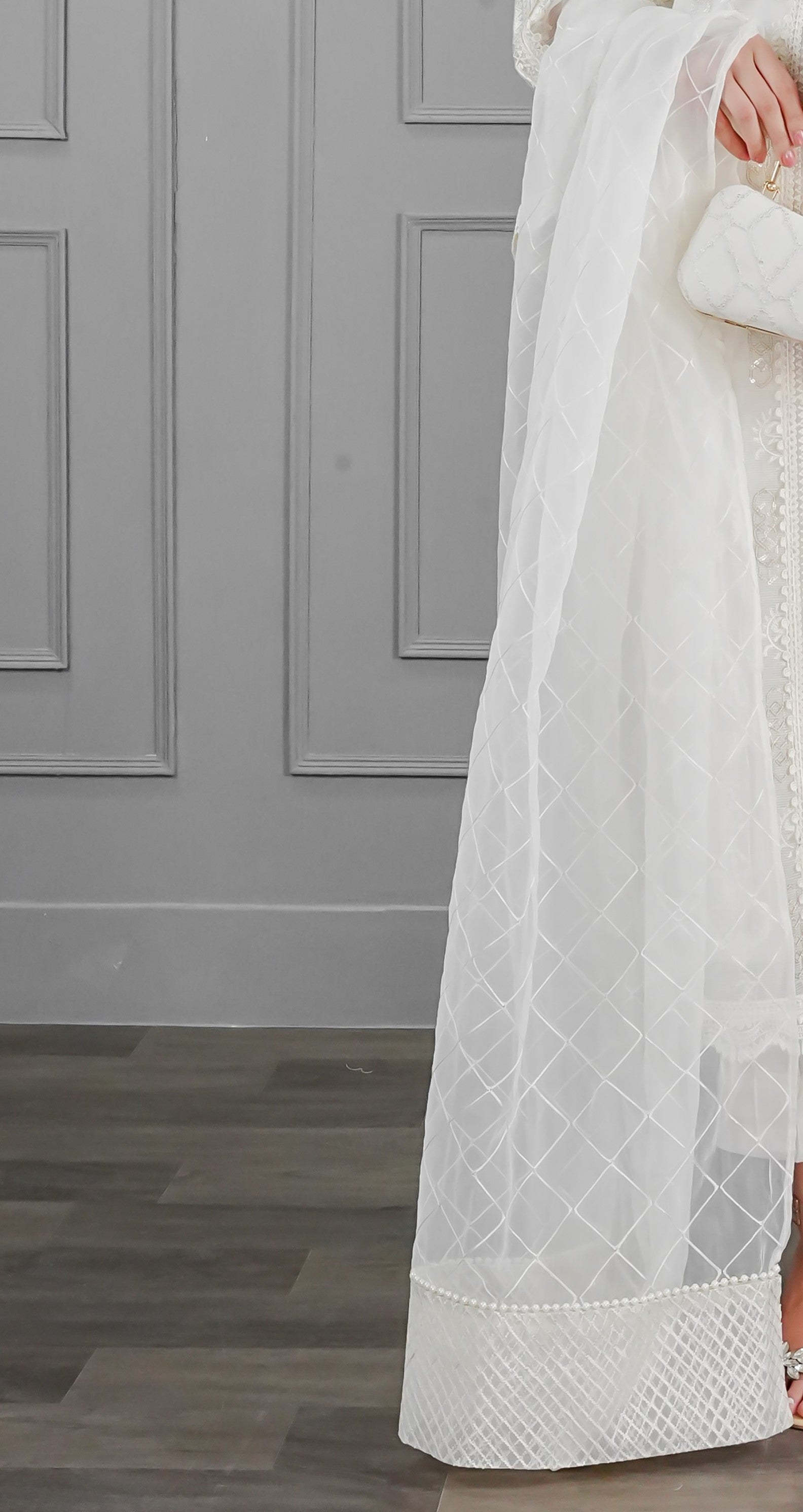 This long white kameez has the most beautiful & intricate details. It has machine embroidery as well as hand work with embellishments like kora dabka & pearls. The shirt also has laces and pops of colors here & there to enhance the overall look.