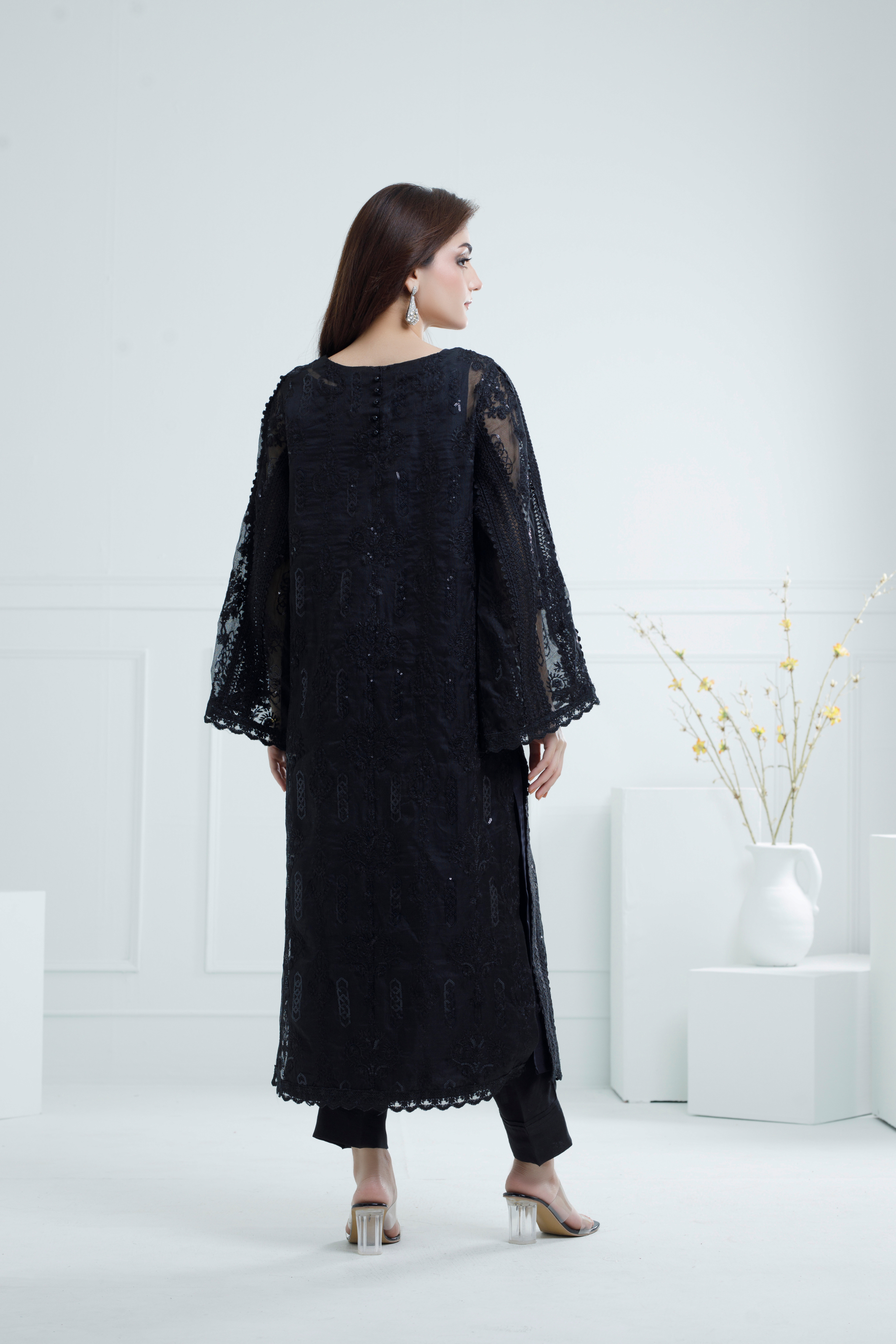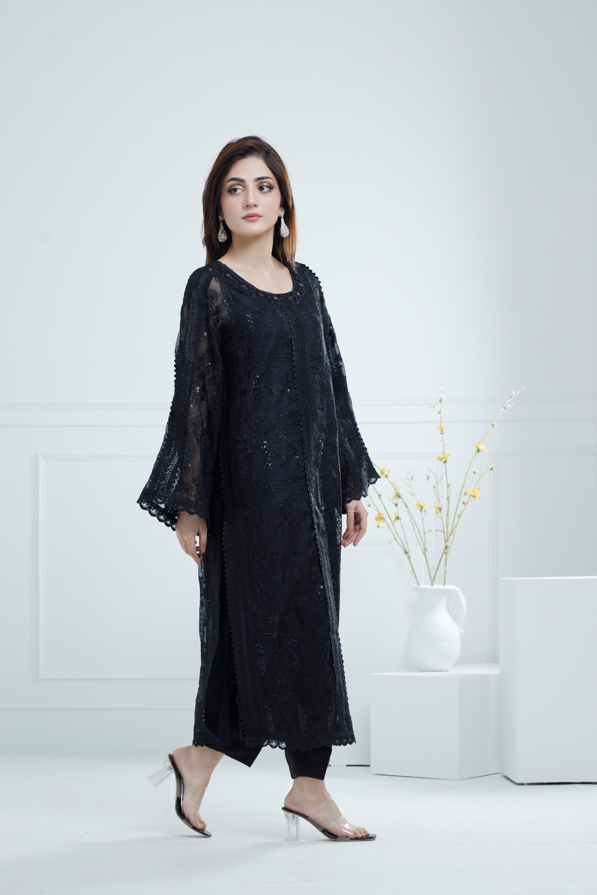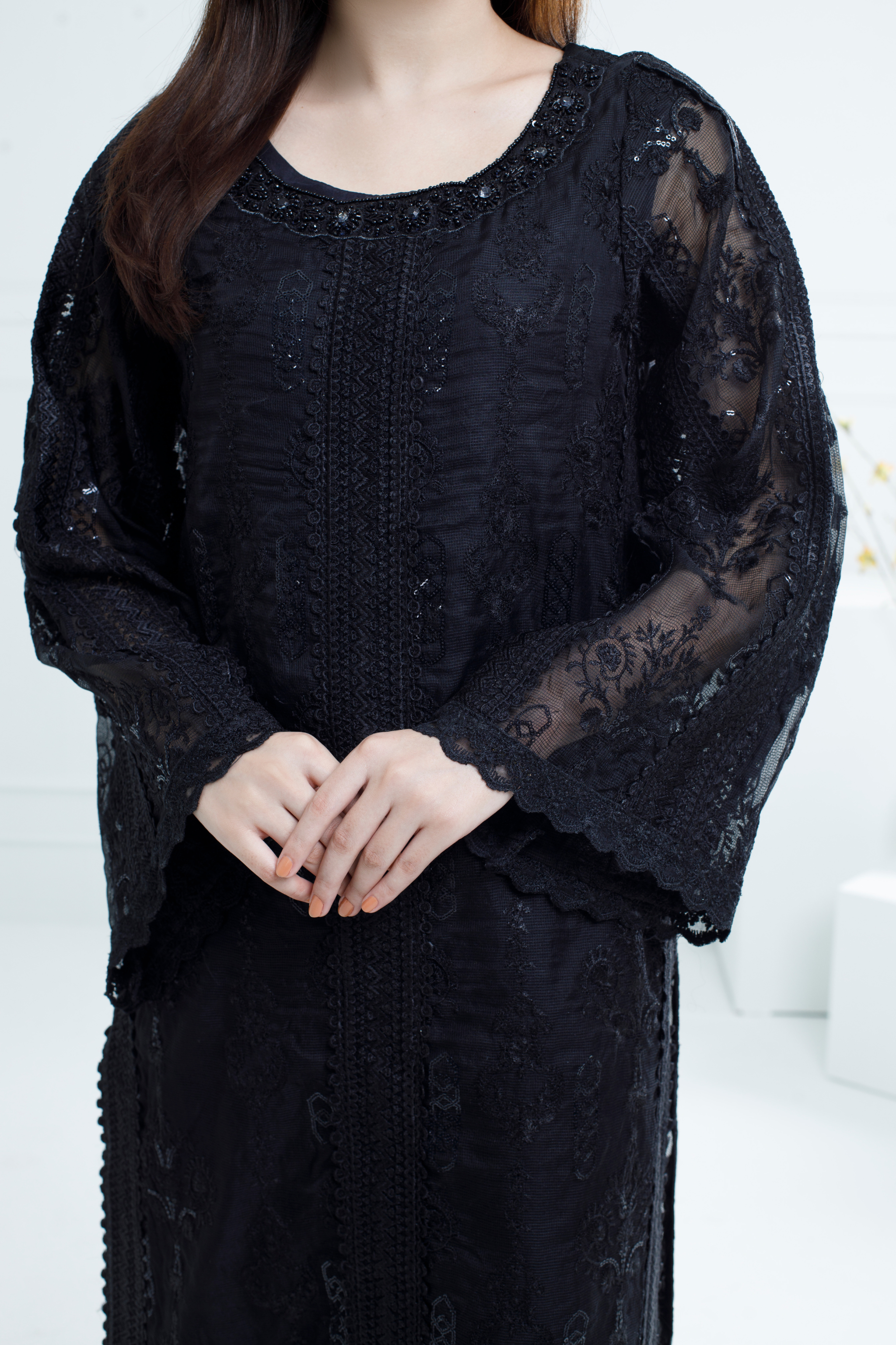 This black Khaddi Net dress exudes timeless elegance with its pure silhouette and intricate embroidery adorning the gala and daman. Enhanced with delicate lace detailing and shimmering sequins and kora dabka, it radiates a refined charm. The thoughtful embellishments and chic design make this outfit a perfect choice for festive seasons, offering a blend of tradition and contemporary sophistication that leaves a lasting impression.