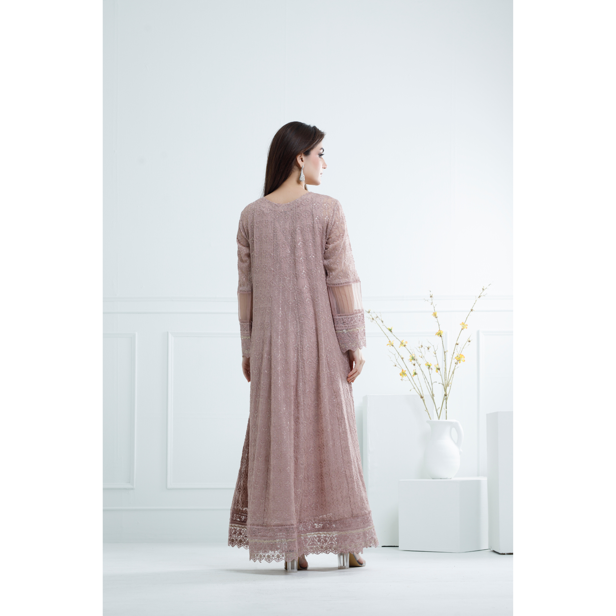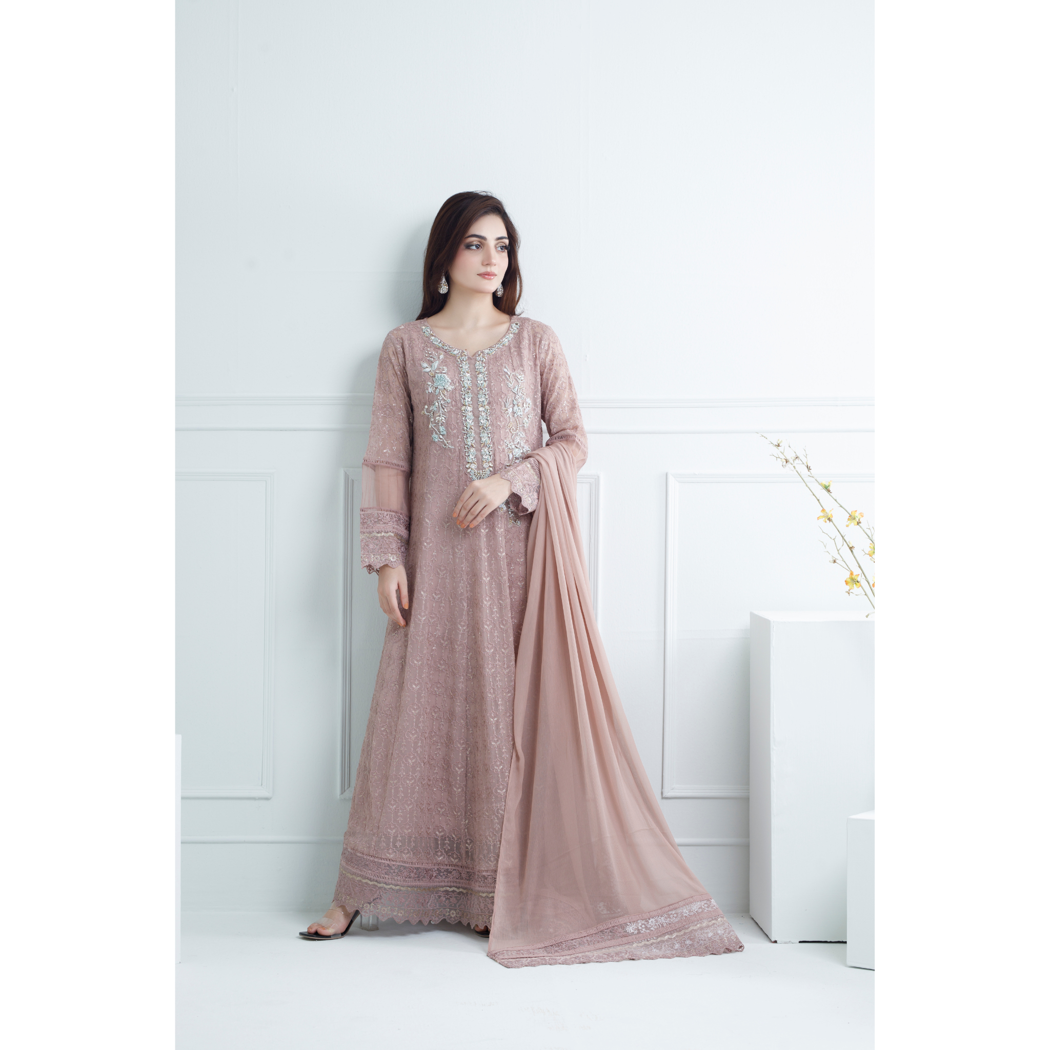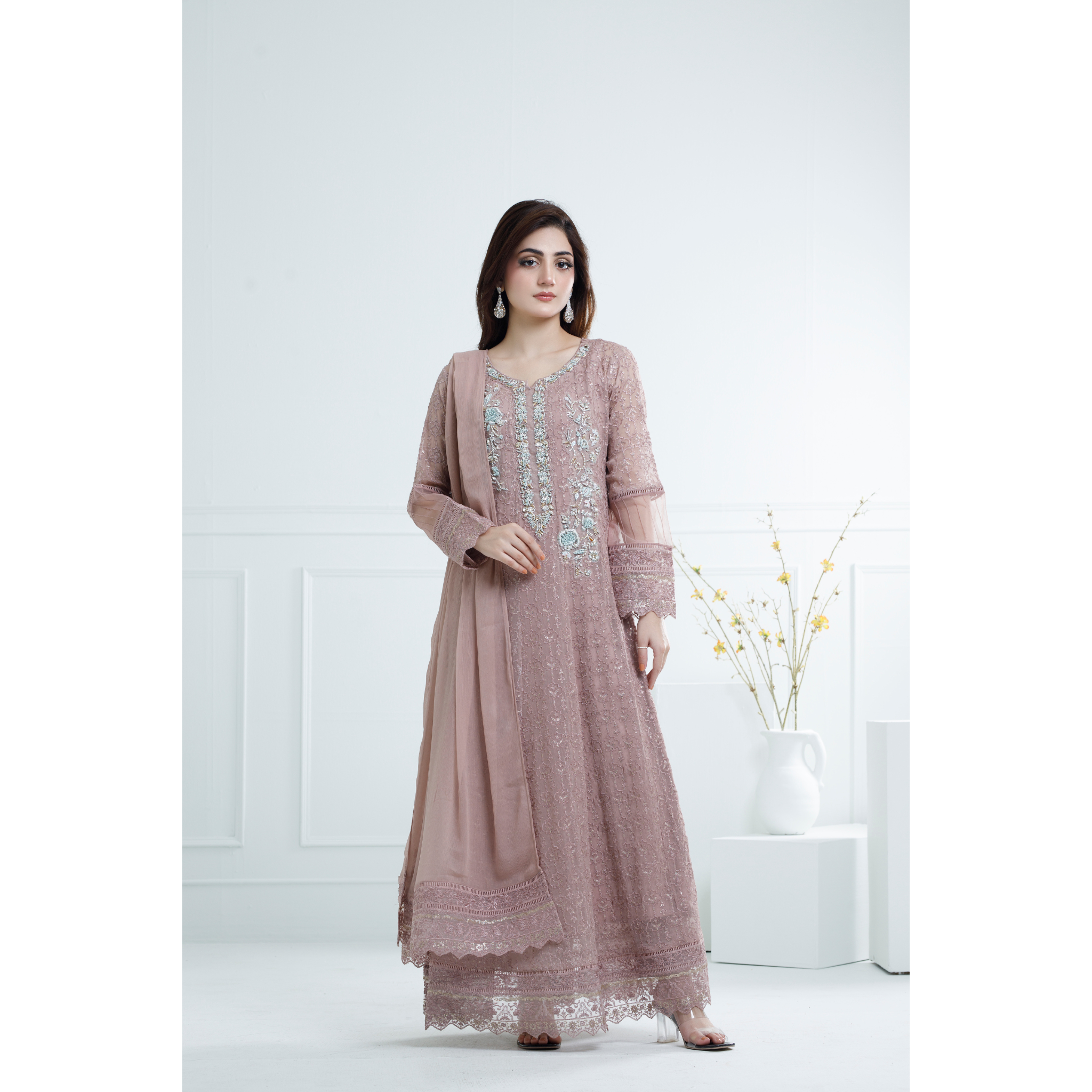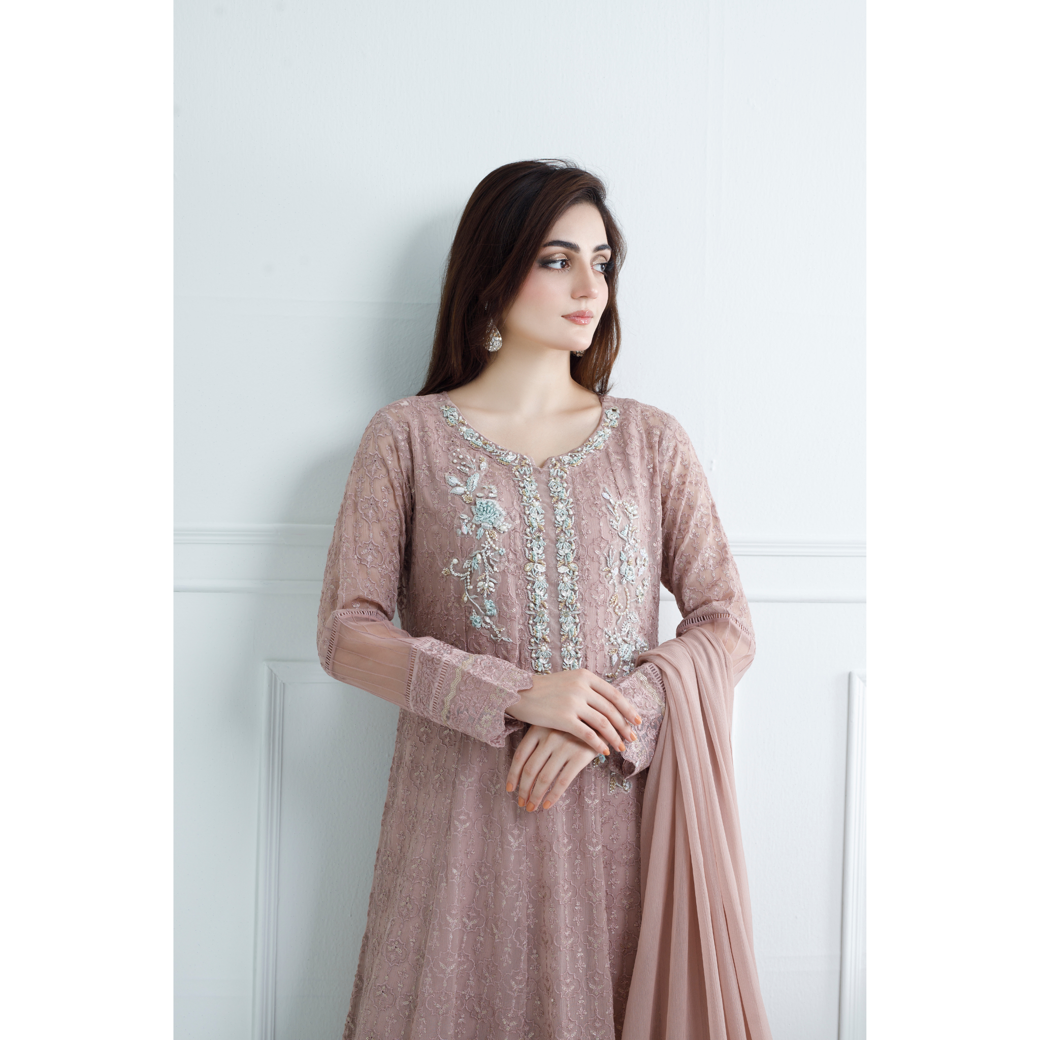 This mauve chiffon dress is a true embodiment of elegance and sophistication. The round neckline is beautifully adorned with intricate embellishments, including motifs, stones, sequins, and fine thread work, creating a striking focal point. The square net sleeves add a delicate touch, while the daman is enhanced with a luxurious chiffon lace that exudes grace. Perfect for formal events or festive occasions, this dress combines its rich details and refined design to offer a timeless and vivid look.