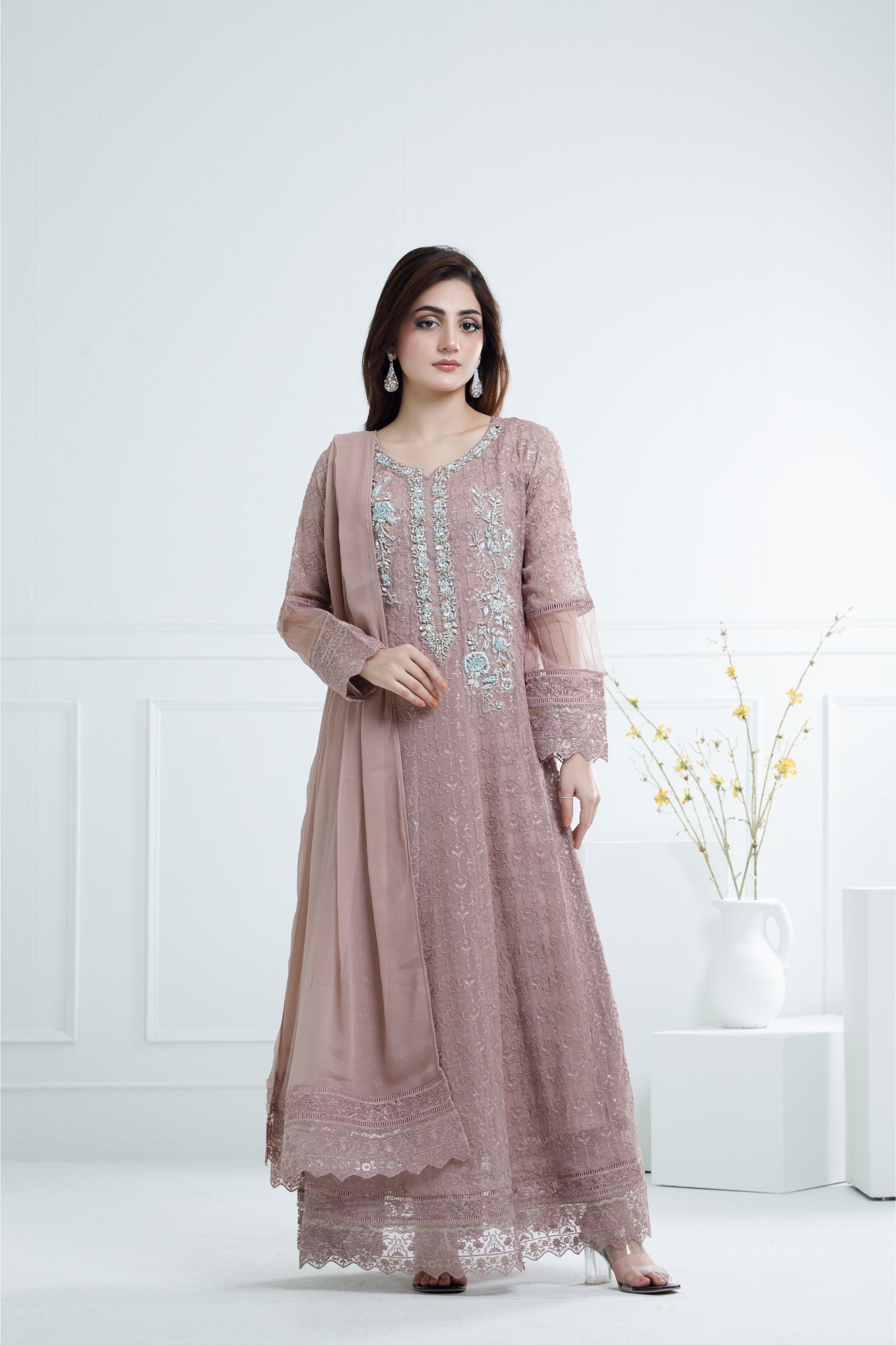 This mauve chiffon dress is a true embodiment of elegance and sophistication. The round neckline is beautifully adorned with intricate embellishments, including motifs, stones, sequins, and fine thread work, creating a striking focal point. The square net sleeves add a delicate touch, while the daman is enhanced with a luxurious chiffon lace that exudes grace. Perfect for formal events or festive occasions, this dress combines its rich details and refined design to offer a timeless and vivid look.