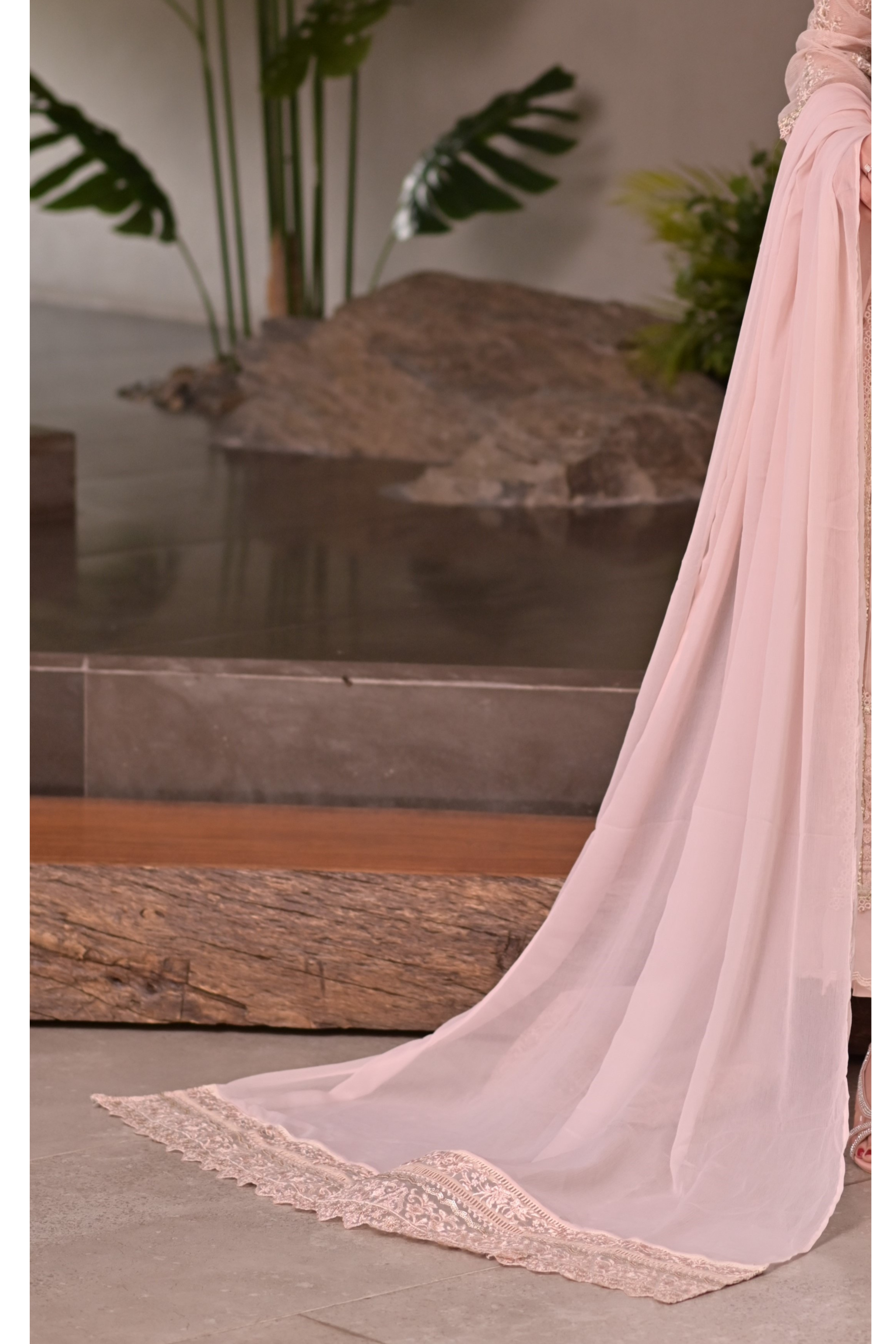 This pink chiffon dress is a true embodiment of elegance and sophistication. The round neckline is beautifully adorned with intricate embellishments, including motifs, stones, sequins, and fine thread work, creating a striking focal point. The square net sleeves add a delicate touch, while the daman is enhanced with a luxurious chiffon lace that exudes grace. Perfect for formal events or festive occasions, this dress combines its rich details and refined design to offer a timeless and vivid look.