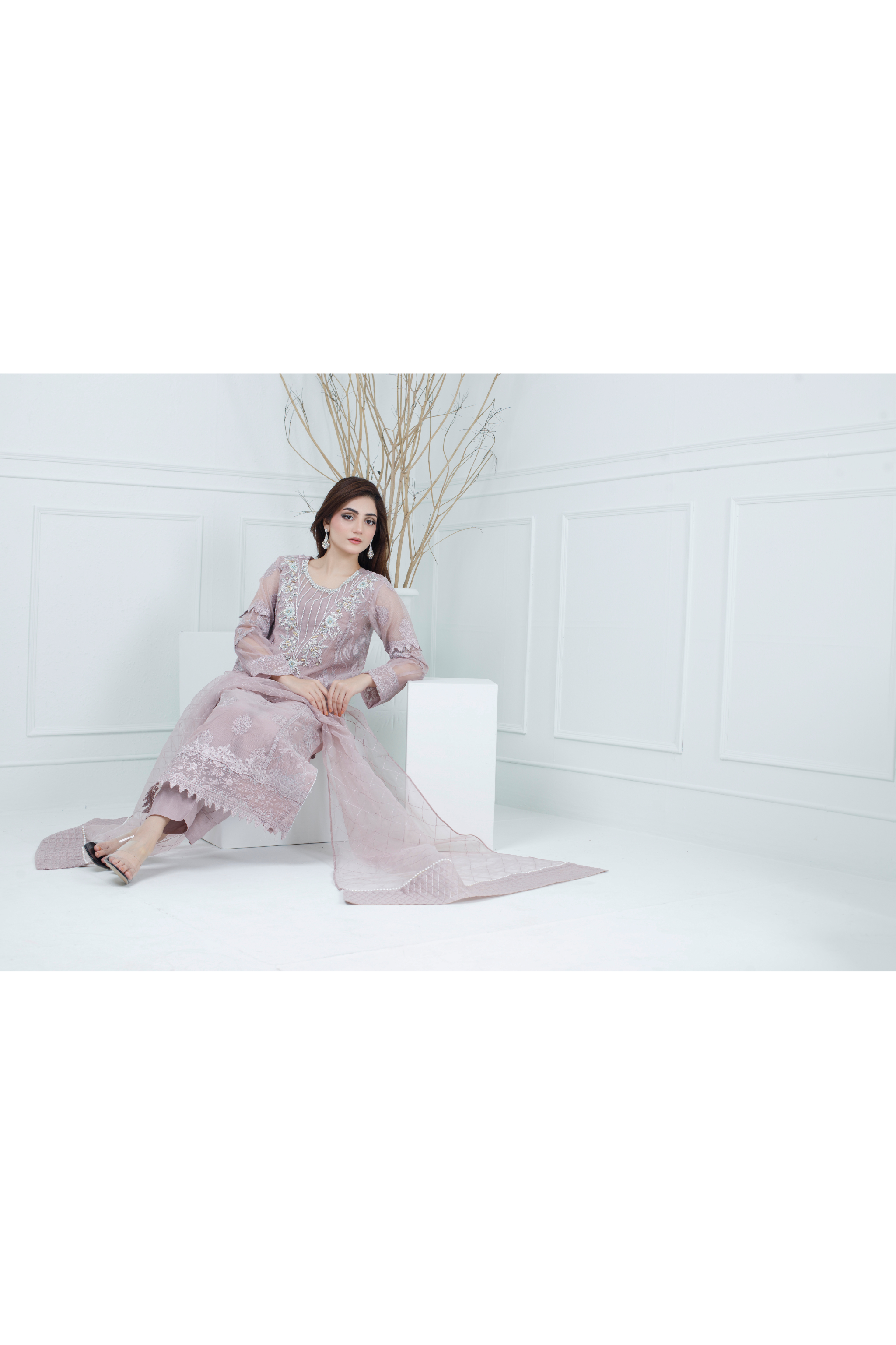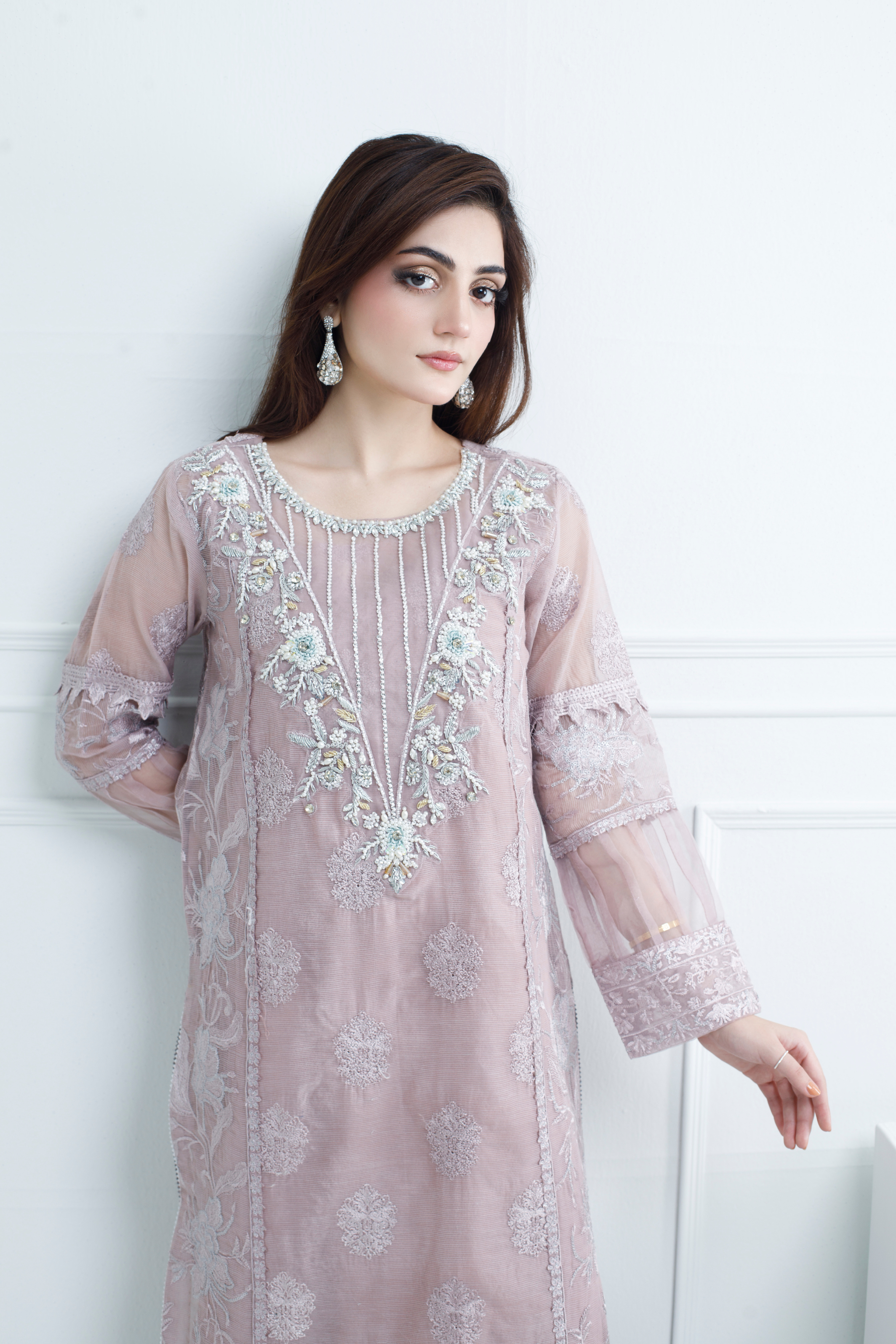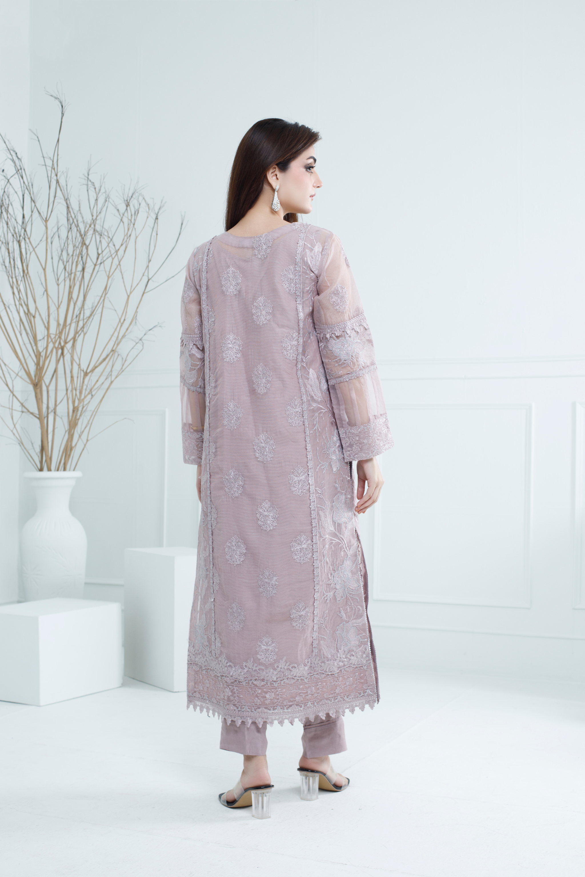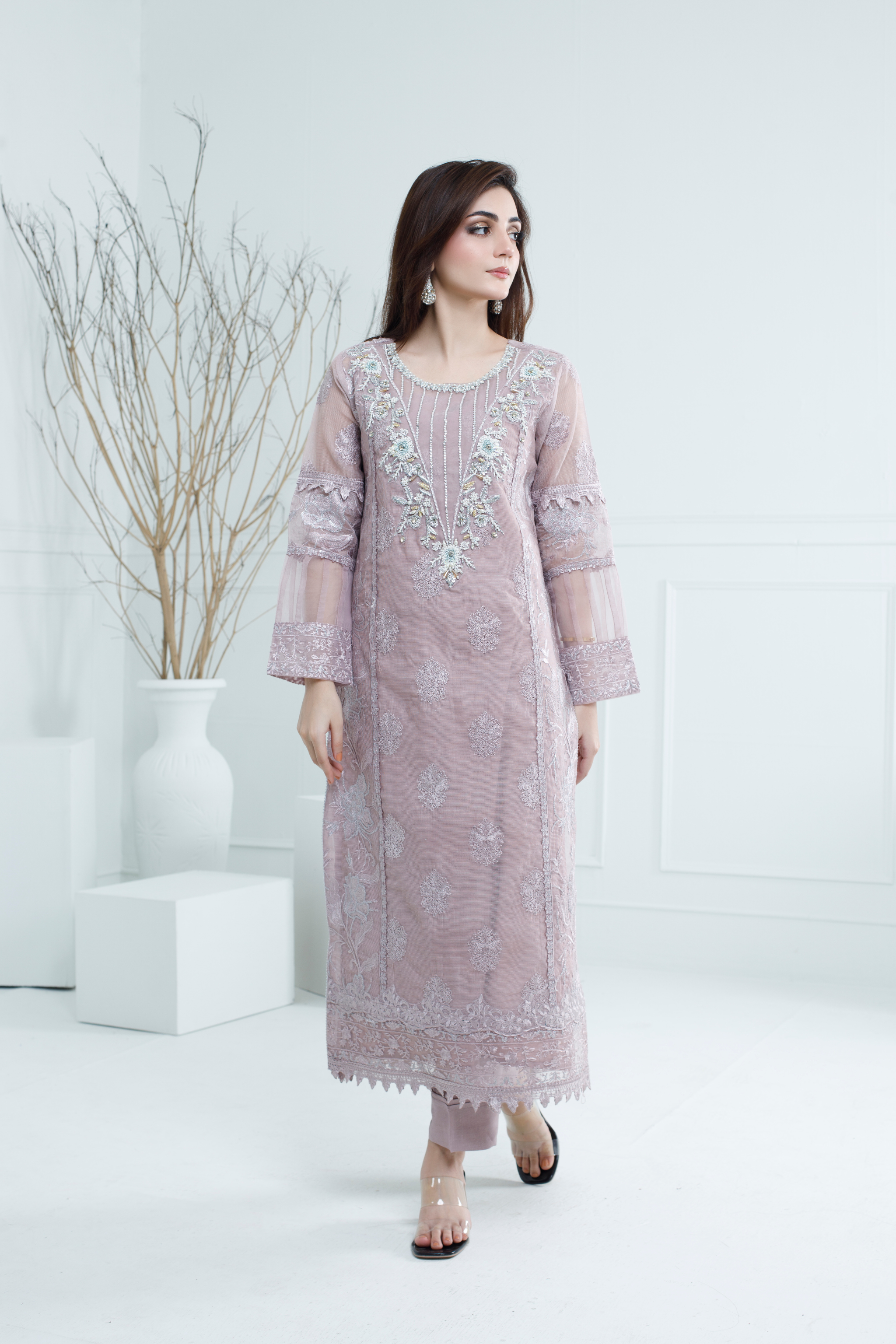 This stunning lilac dress in luxurious Khaddi Net exudes timeless elegance. The V-styled neckline is luxuriously designed, while the daman features intricate lace detailing adorned with a beautiful arrangement of motifs, embellishments, sequins, fine thread work, and hand embroidery. The heavy embellishment throughout the dress elevates its charm, creating a regal aesthetic. Paired with a contrasting lilac trouser, this dreamy outfit offers sophisticated look. The sleeves are beautifully accented with square net lace, adding a touch of refinement. Perfect for formal gatherings and festive occasions, this dress combines intricate craftsmanship with exquisite details for a attention-grabbing charm.