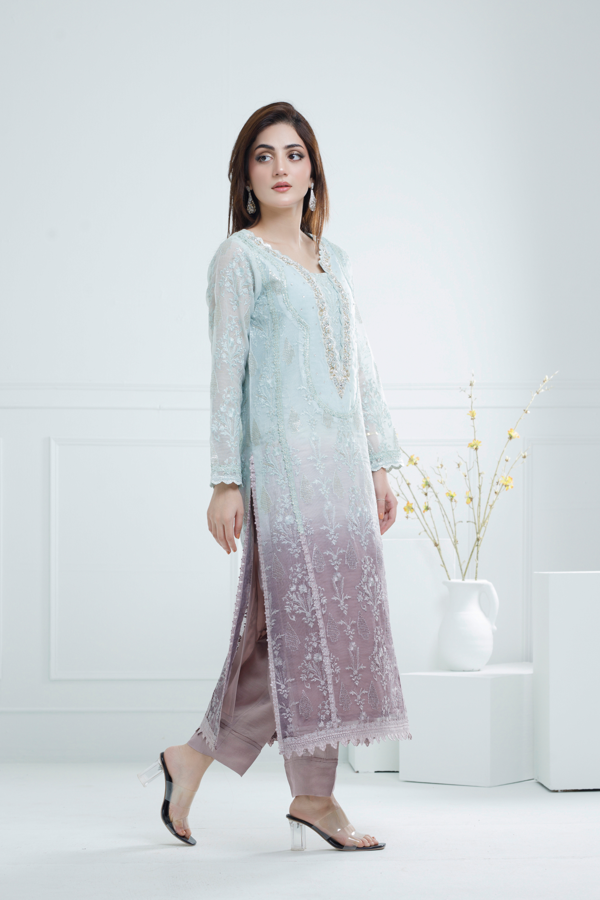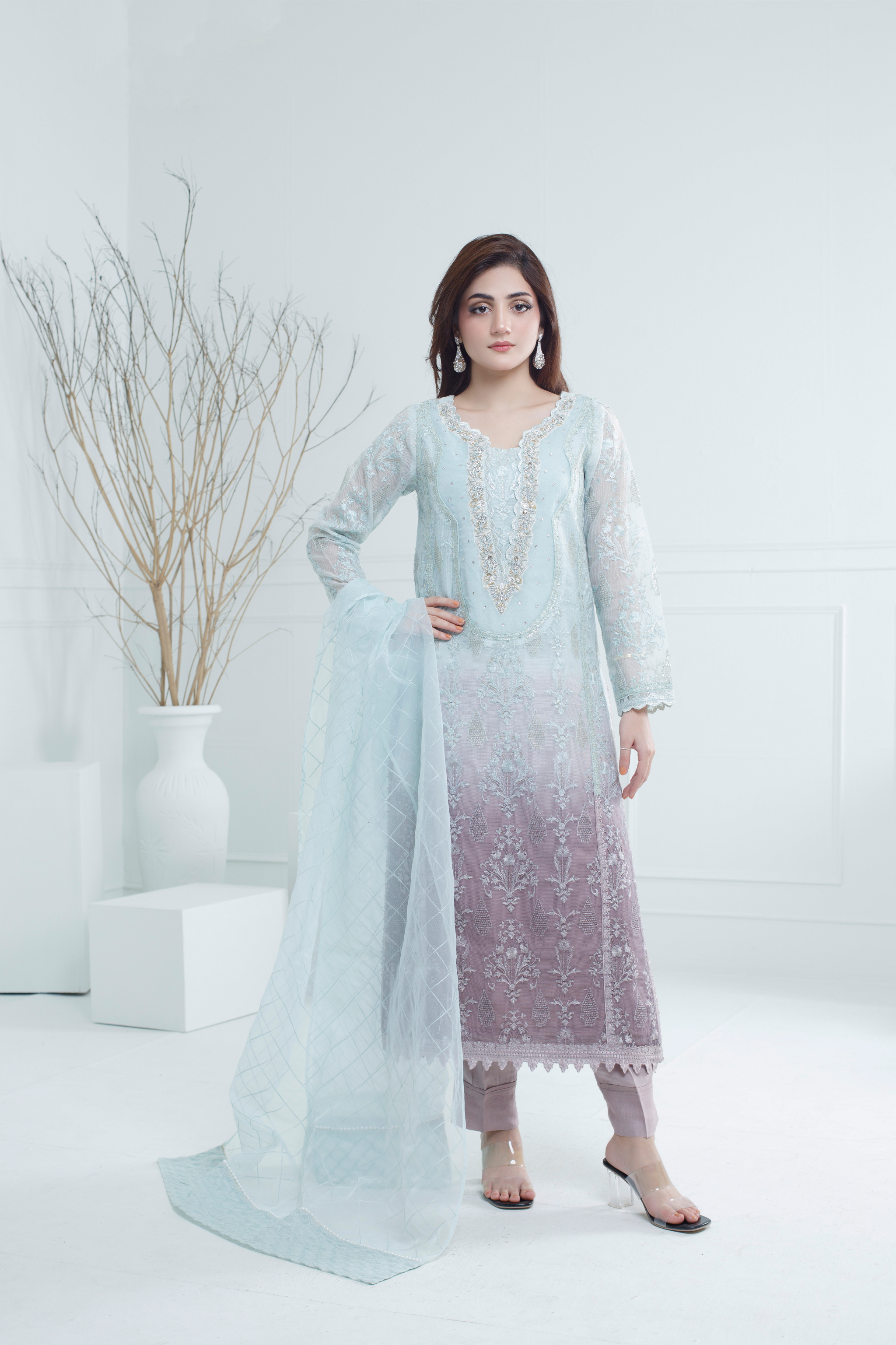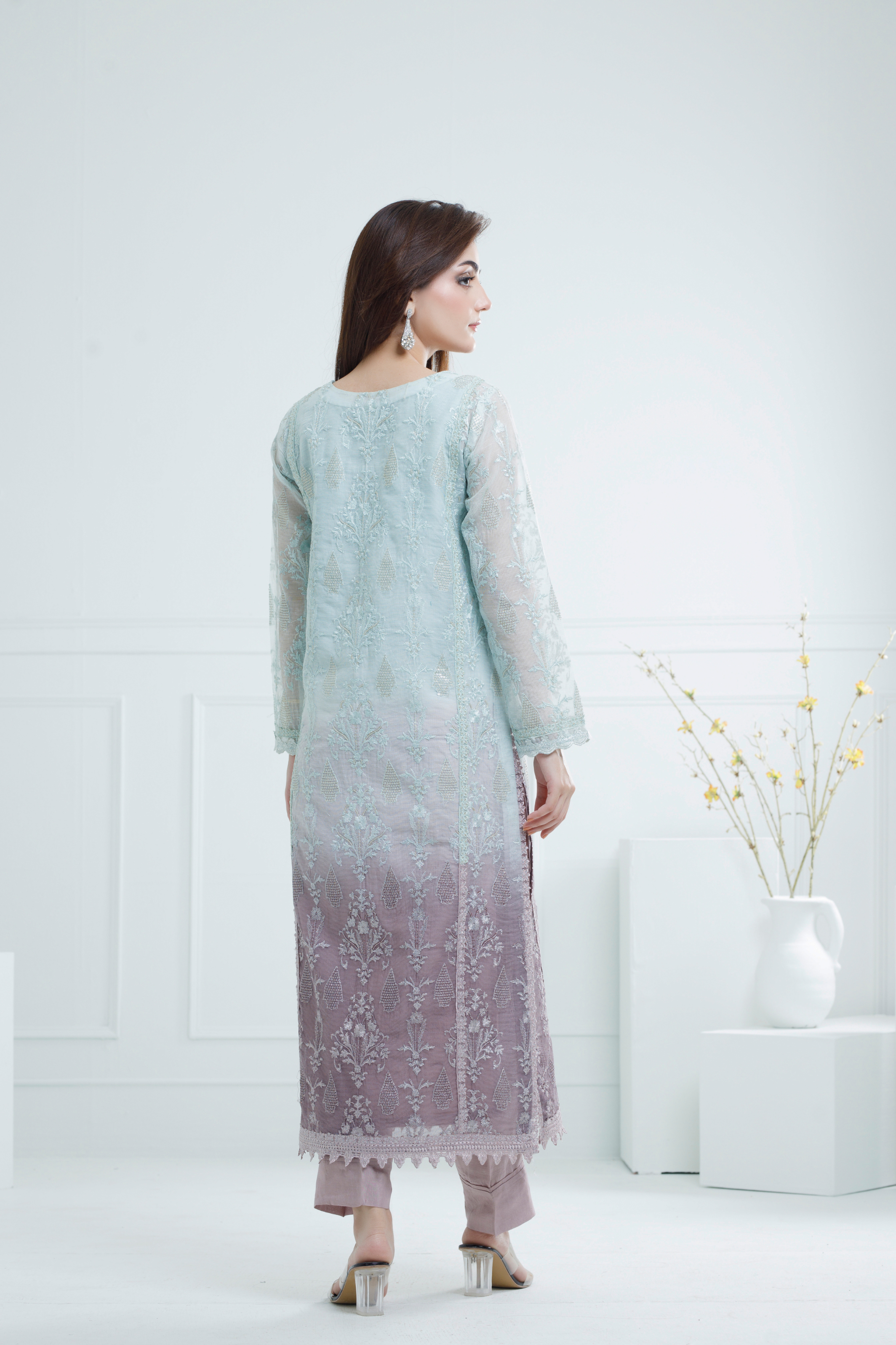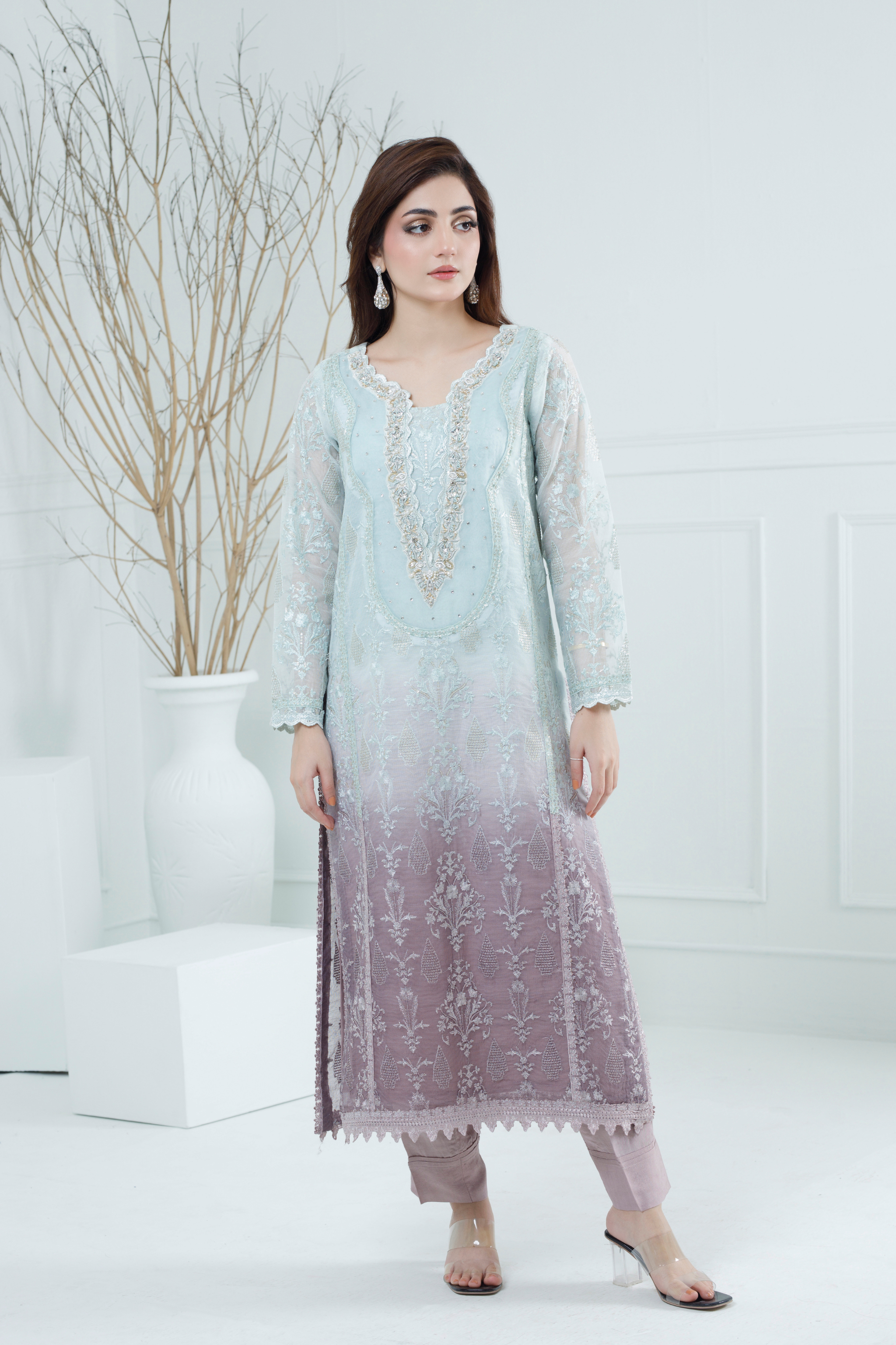 This elegant dress, crafted from luxurious Khaddi Net fabric, features a stunning gradient of ice blue and lilac tones, paired with a lilac trouser. The V-style neckline is heavily embellished with stones, sequins and crystals, also sleeves are beautifully handcrafted, adding sophistication to the design. Intricate lace detailing on the daman and delicate motifs elevate its charm, blending modern elegance with traditional craftsmanship. Perfect for weddings, festive occasions, or formal gatherings, this outfit ensures a graceful and eye-catching appearance.