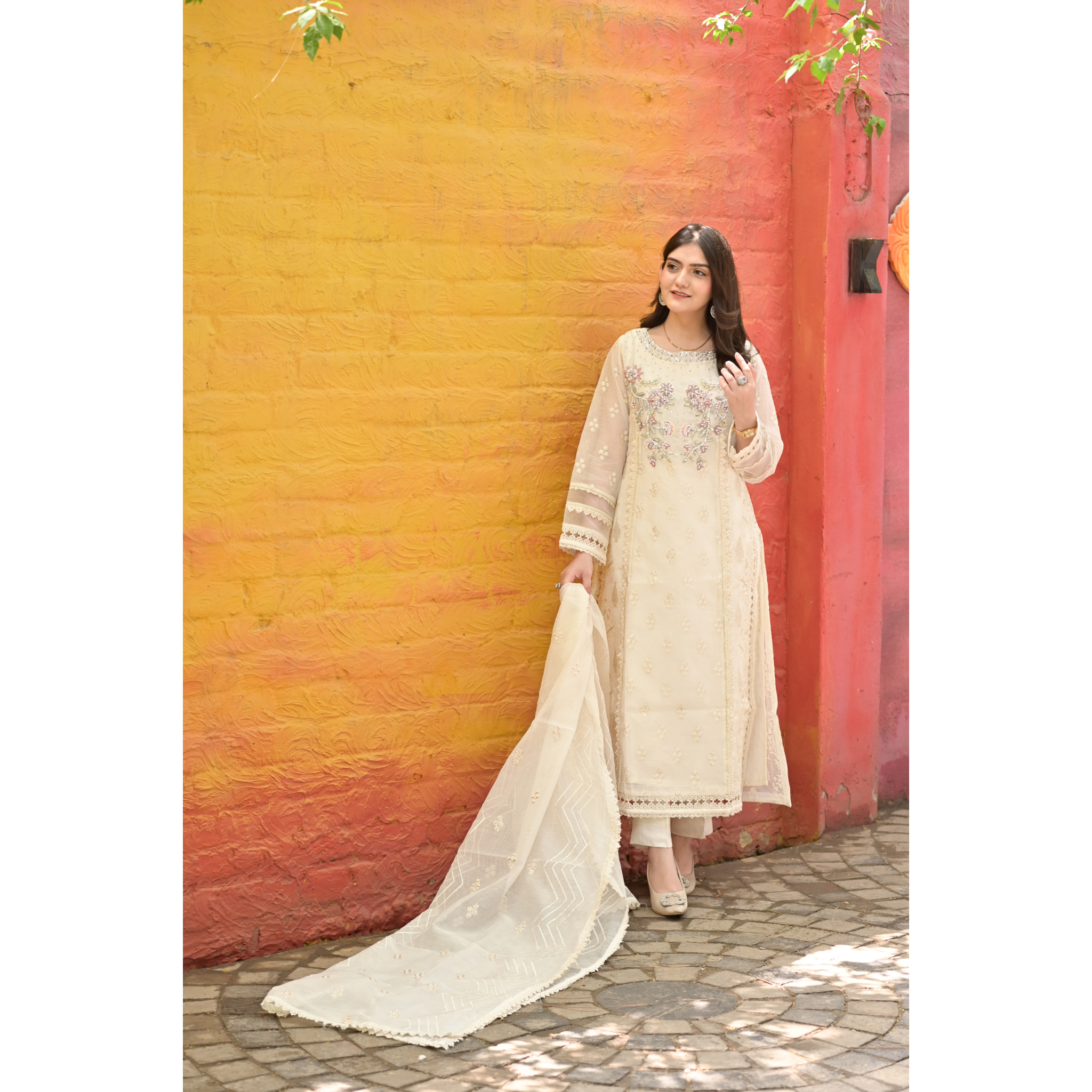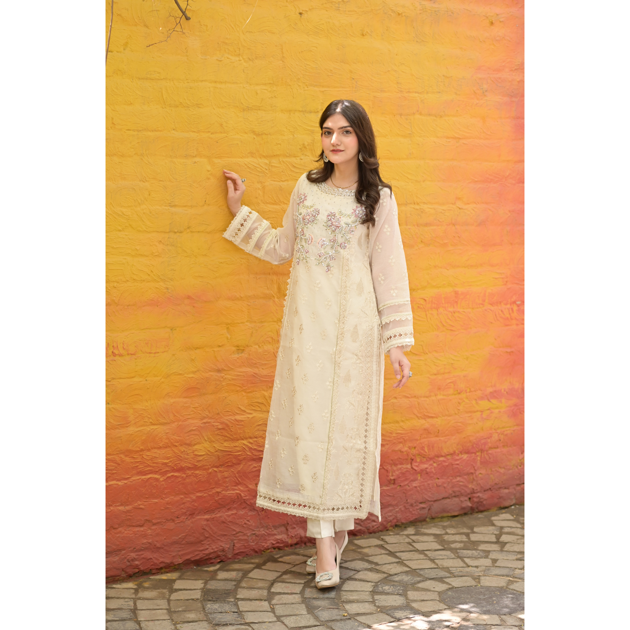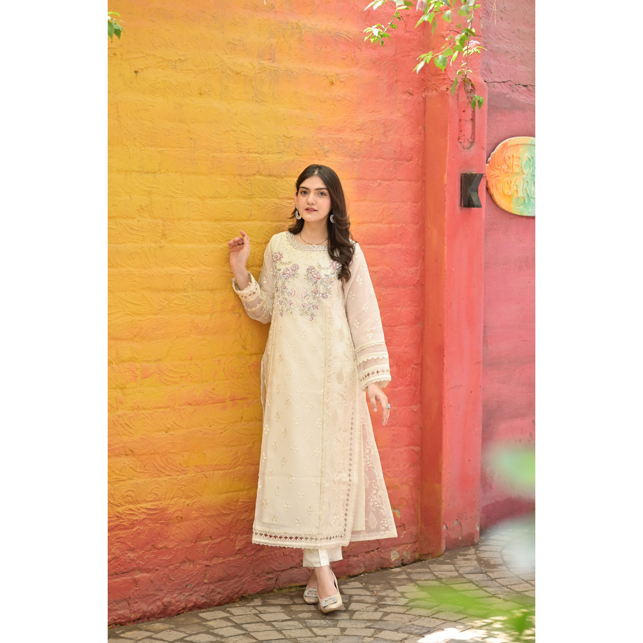 This ivory dress is the epitome of elegance & craftmanship. Made from premium Khaddi net, the outfit features a soft, airy texture that drapes beautifully and offers a regal silhouette. The highlight of this ensemble is its handcrafted neckline and floral bunches, delicately embellished with kora, dabka, stones, and pearls. Its sheer full-length sleeves add a touch of modern grace, finished with embroidered cuffs that mirror the detailing on the front. The hemline & borders are thoughtfully adorned with fine thread embroidery & embellished accents that elevate the overall ensemble. Perfect for festive occasions, formal events, this outfits brings together timeless tradition and contemporary sophistication.