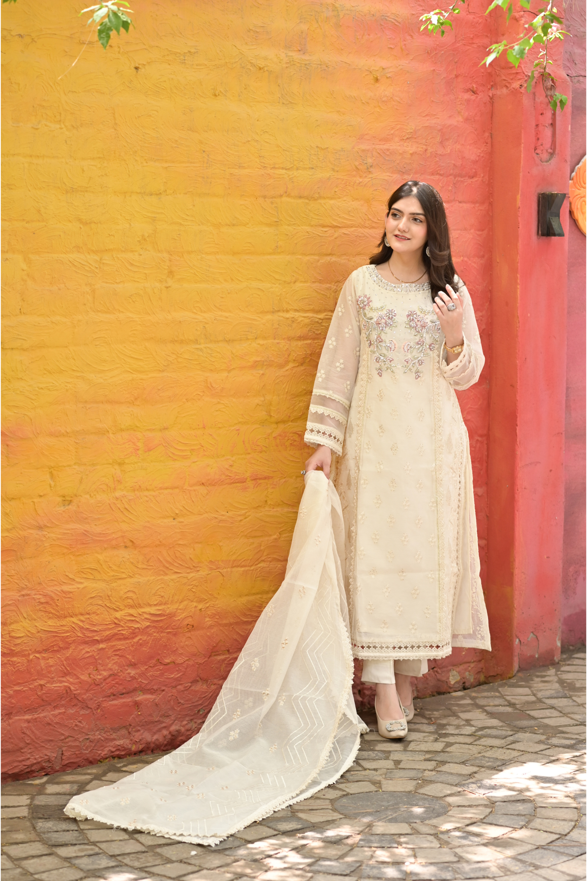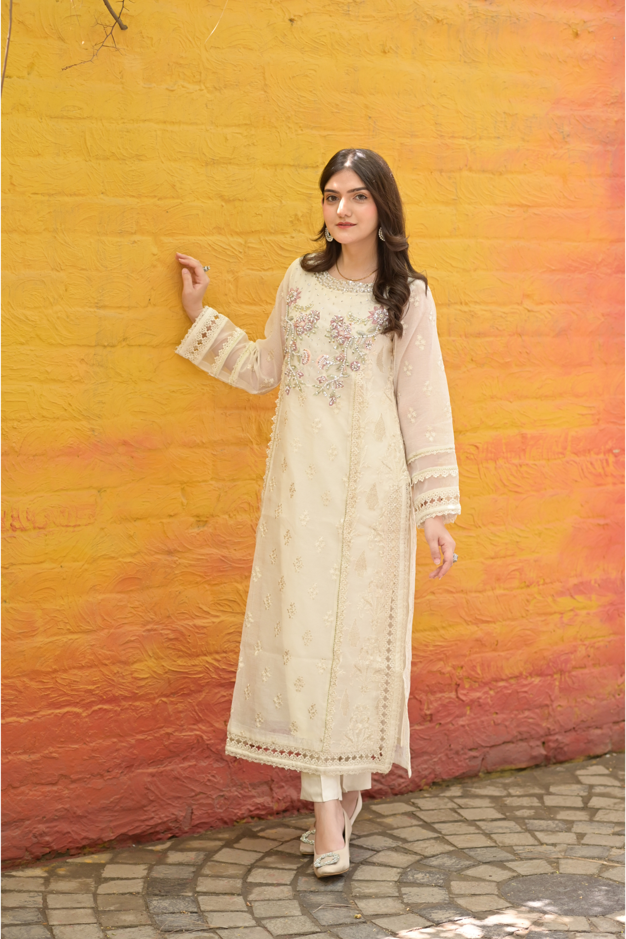 This ivory dress is the epitome of elegance & craftmanship. Made from premium Khaddi net, the outfit features a soft, airy texture that drapes beautifully and offers a regal silhouette. The highlight of this ensemble is its handcrafted neckline and floral bunches, delicately embellished with kora, dabka, stones, and pearls. Its sheer full-length sleeves add a touch of modern grace, finished with embroidered cuffs that mirror the detailing on the front. The hemline & borders are thoughtfully adorned with fine thread embroidery & embellished accents that elevate the overall ensemble. Perfect for festive occasions, formal events, this outfits brings together timeless tradition and contemporary sophistication.
