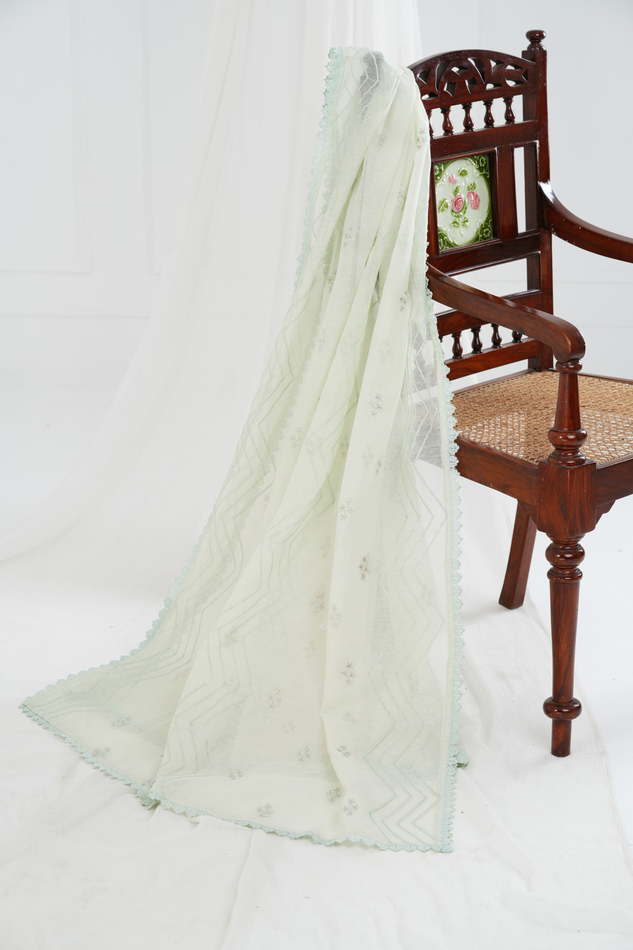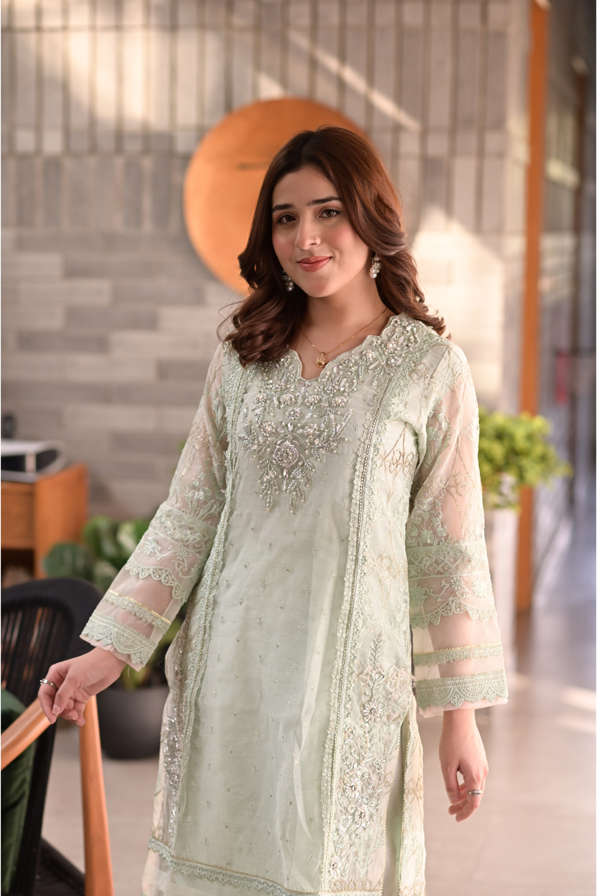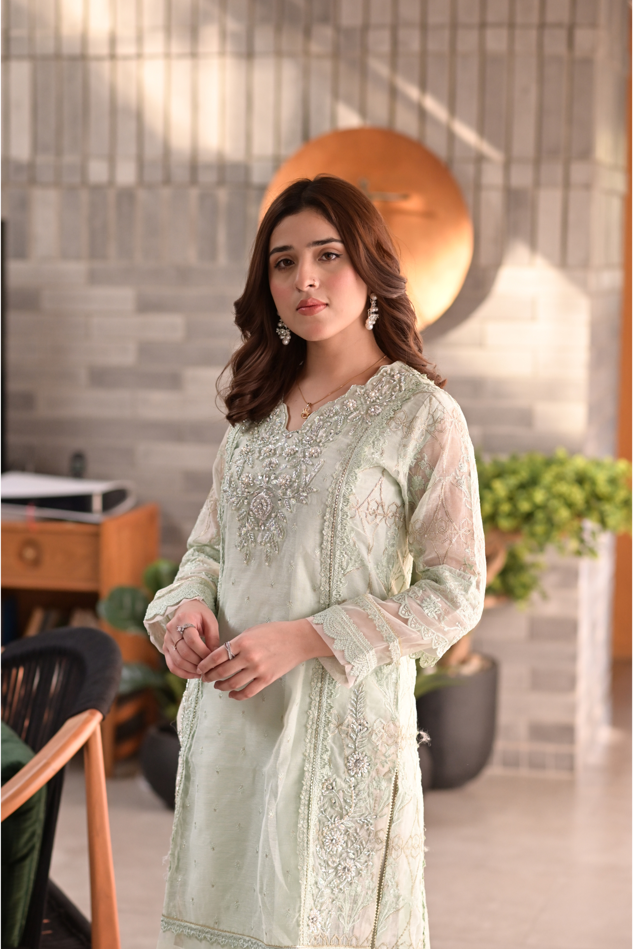 This mint green shade exudes freshness and grace, making it a perfect choice for any elegant occasion. Crafted from luxurious Khaddi Net fabric, the outfit features a flattering V-neckline adorned with intricate Kora Dabka work, delicately embellished with stones and pearls for a refined, sophisticated look.
