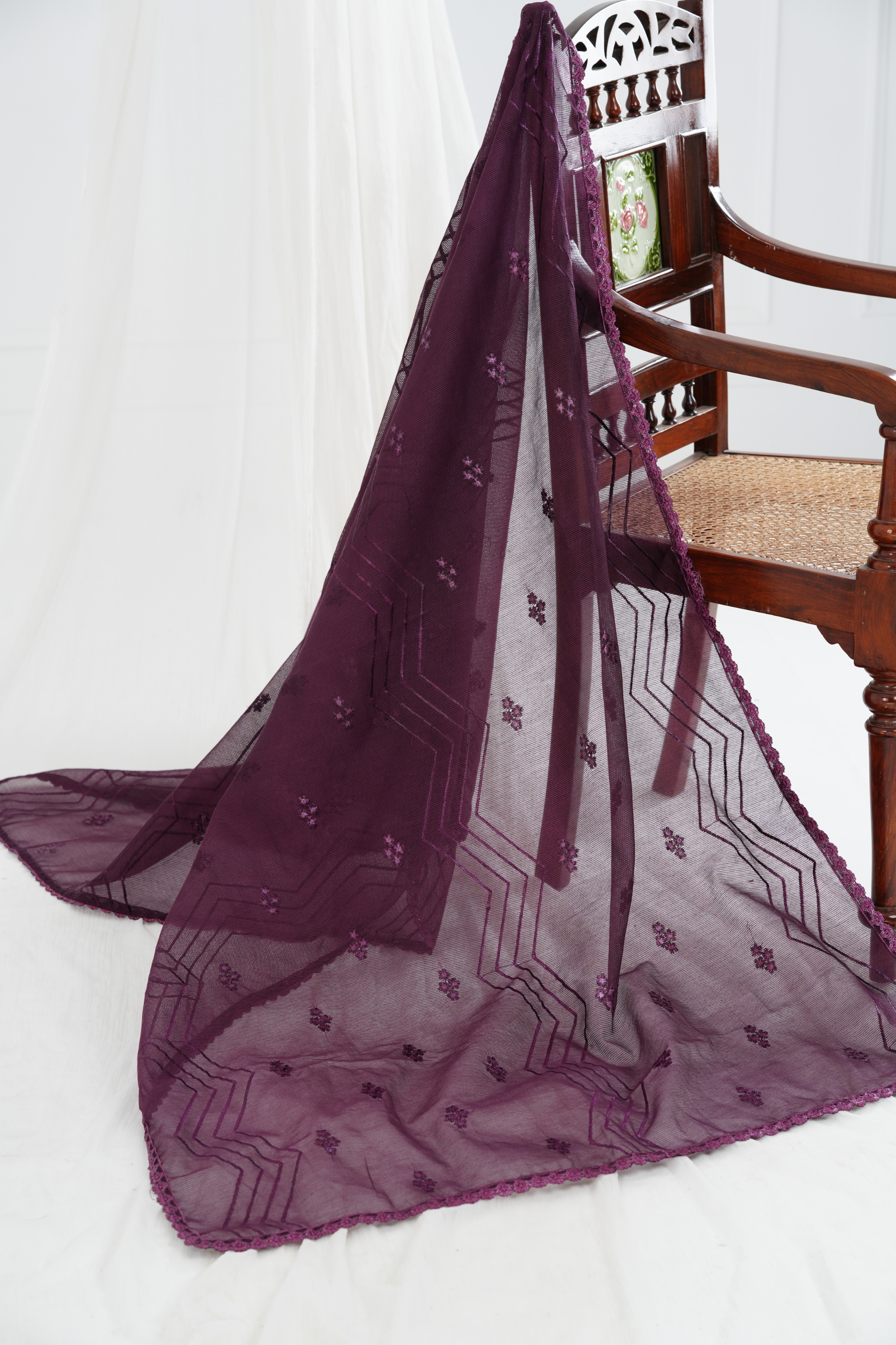 This stunning deep plum khaddi net dress is a blend of elegance and traditional charm, featuring detailed embroidery on both the front and back. The neckline and front panels are embellished with delicate handwork of kora, dabka, and sparkling stones, adding a luxurious feel. The lace detailing on the daman and sleeves enhances its femininity and style. Paired with matching raw silk trousers and inner, this 3-piece ensemble is perfect for festive events and formal gatherings, making it a timeless and eye-catching choice.