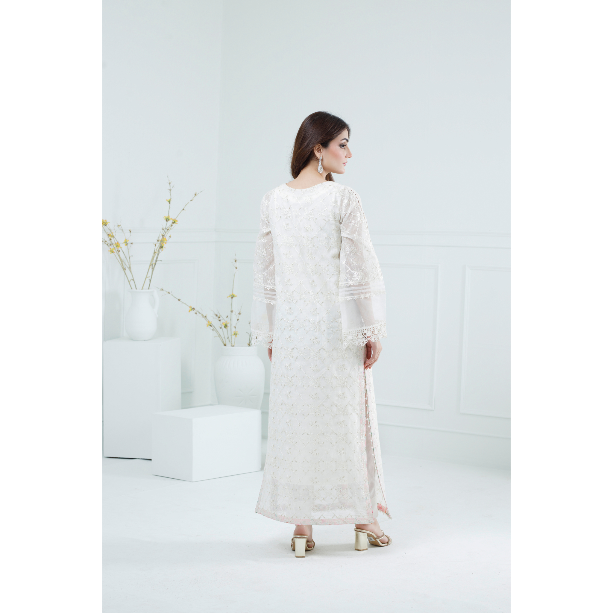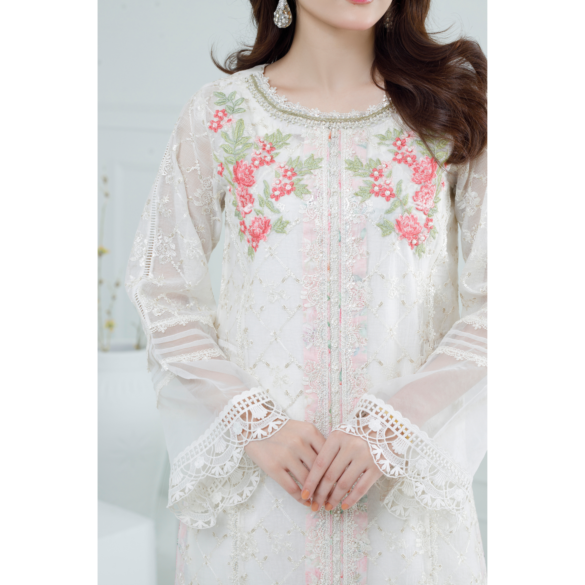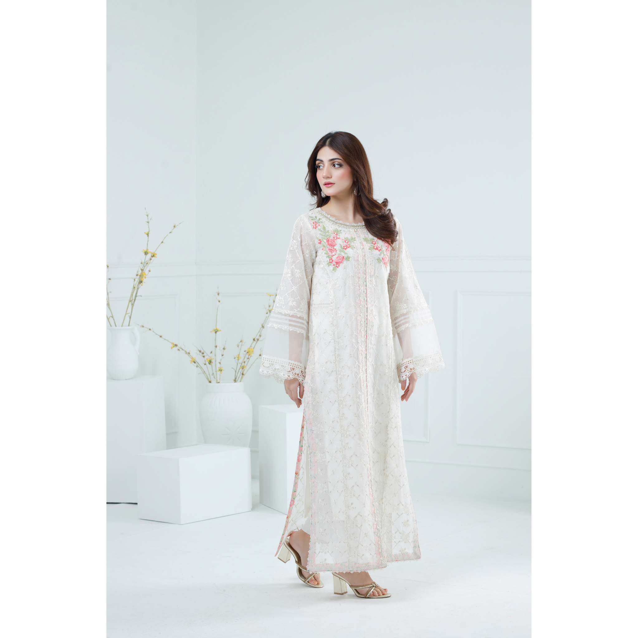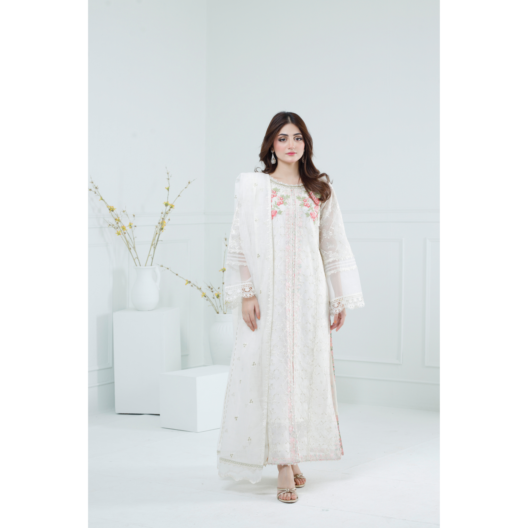 This ivory ensemble is crafted from luxurious khaddi net fabric, exuding timeless elegance. The long shirt features intricate embellishments, delicate embroidery in pink, white, and green threads, kora dabka, motifs and pearls, all beautifully designed to create a sophisticated aesthetic. The round neckline and net sleeves are gracefully adorned, adding a touch of refinement. Paired with a matching dupatta, this outfit embodies exquisite craftsmanship and style, perfect for special occasions.