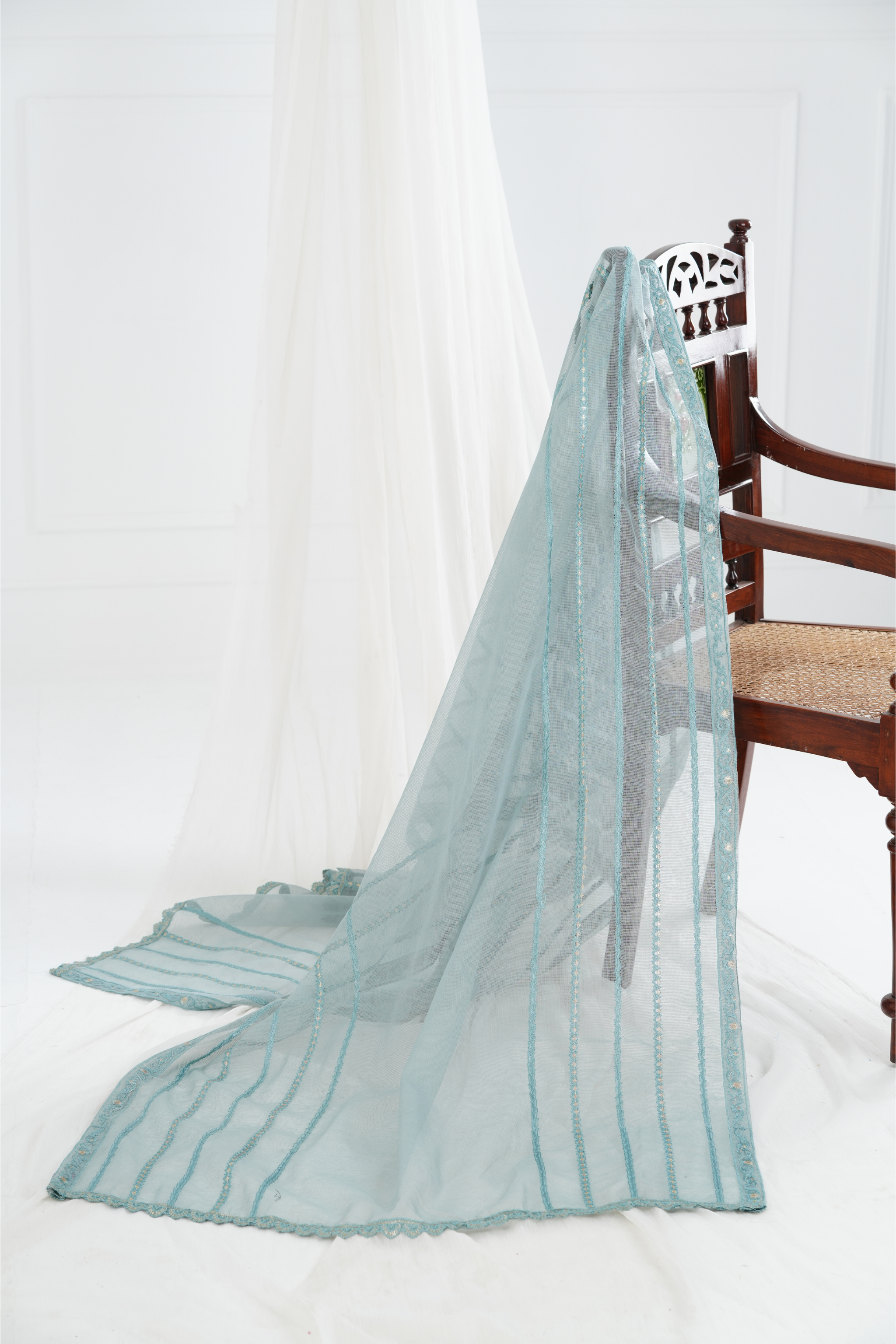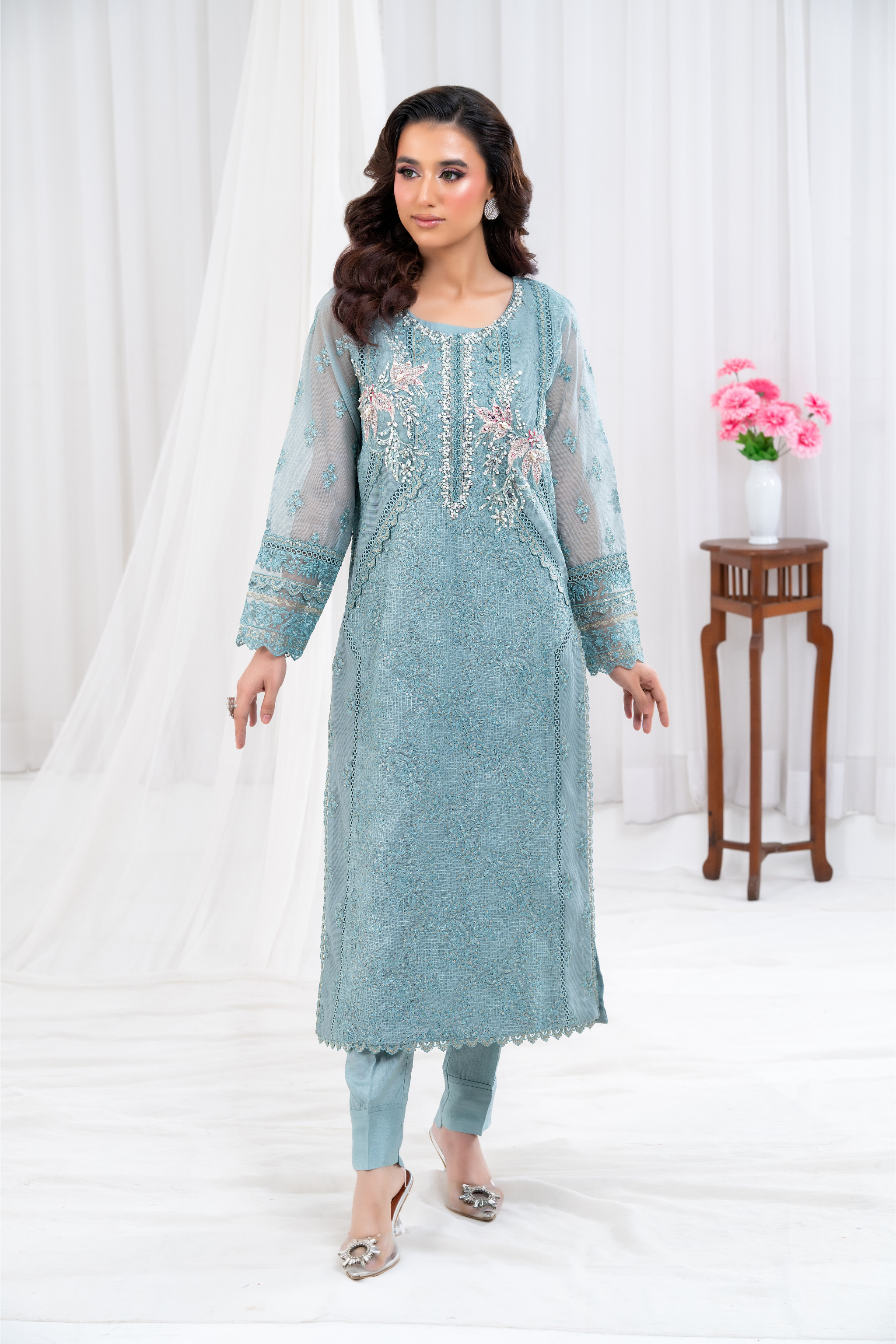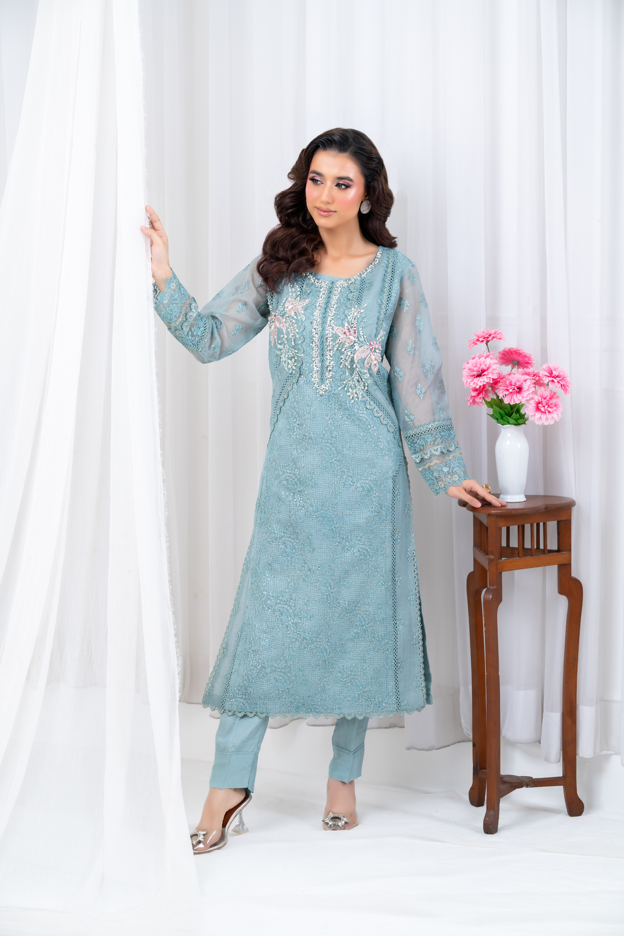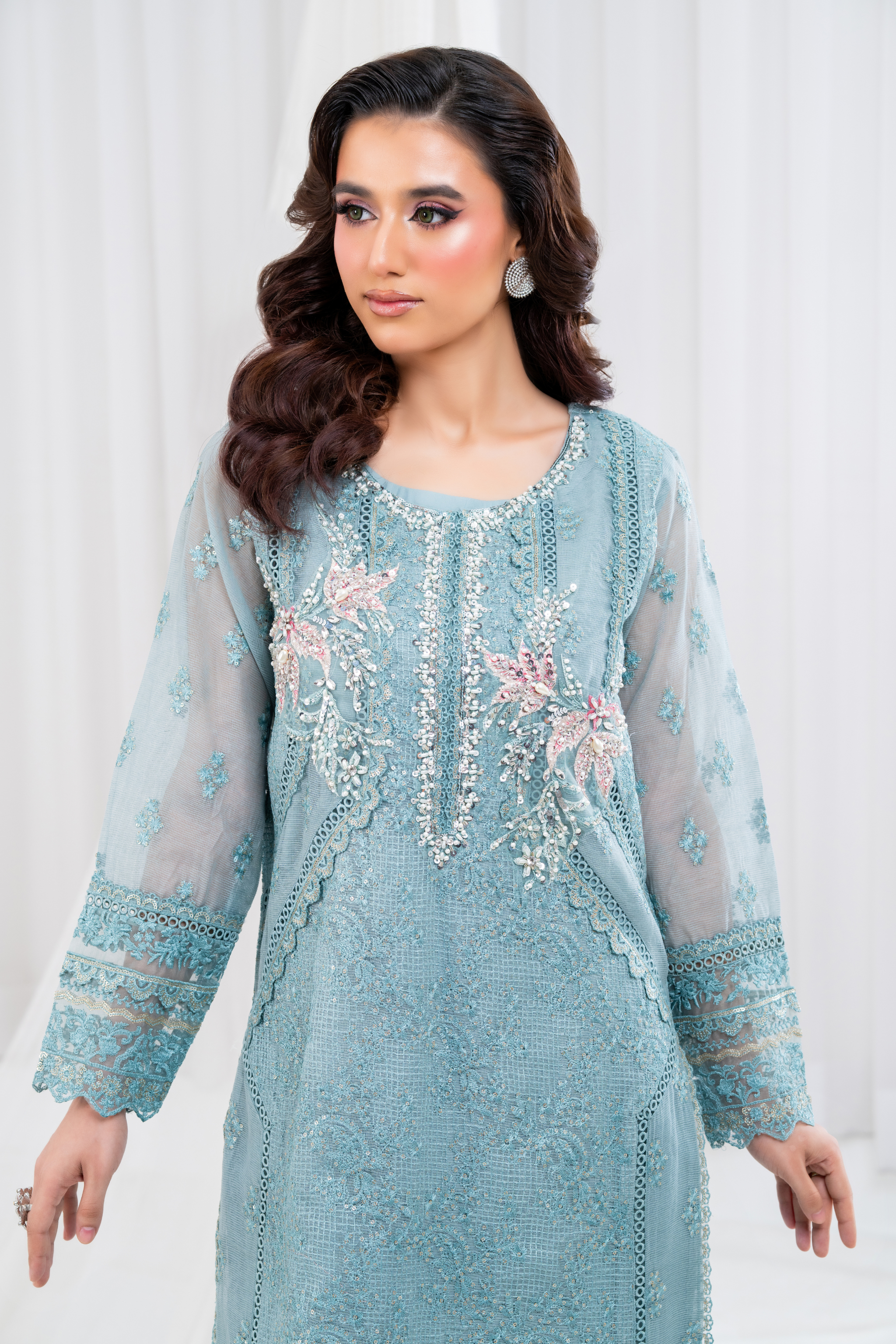 This stunning sea-blue khaddi net dress is a perfect blend of elegance and traditional charm. It features detailed handwork on the neckline and motifs, adorned with kora, dabka, stones, and pearls for a rich, sophisticated look. The lace detailing on the daman and sleeves adds a delicate finishing touch. Paired with matching raw silk trousers and a comfortable inner, this 3-piece ensemble is perfect for festive events and formal gatherings, making it a timeless and graceful choice.