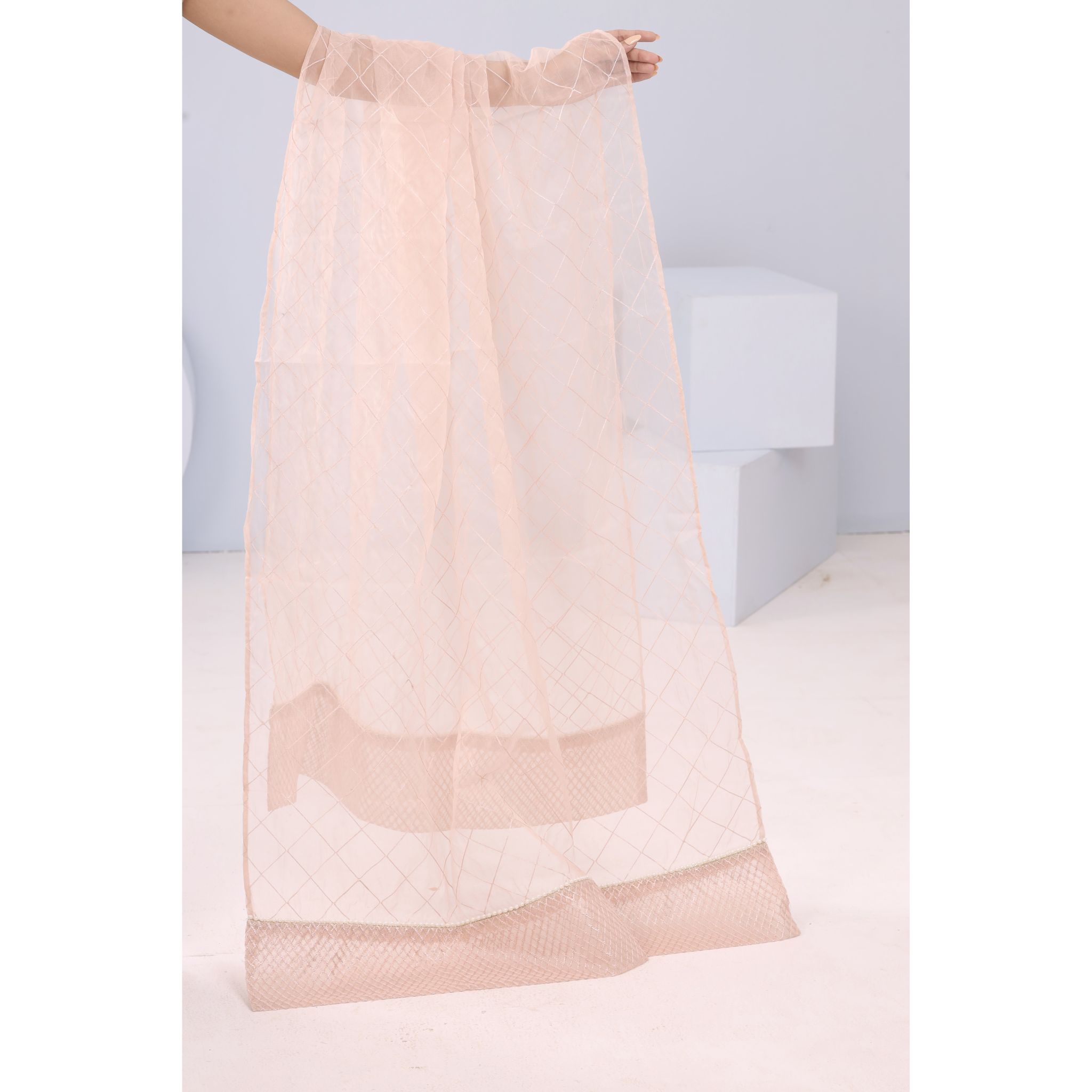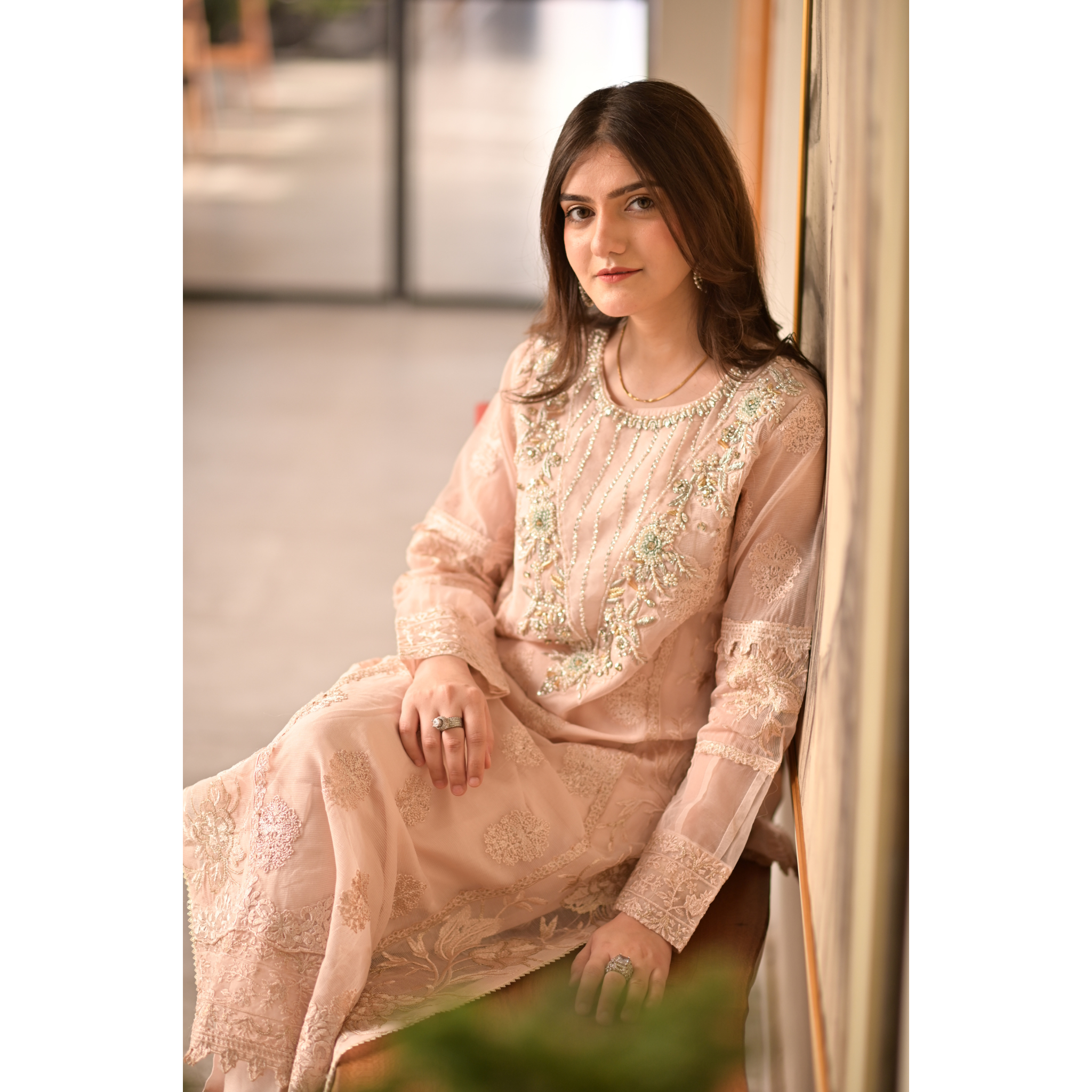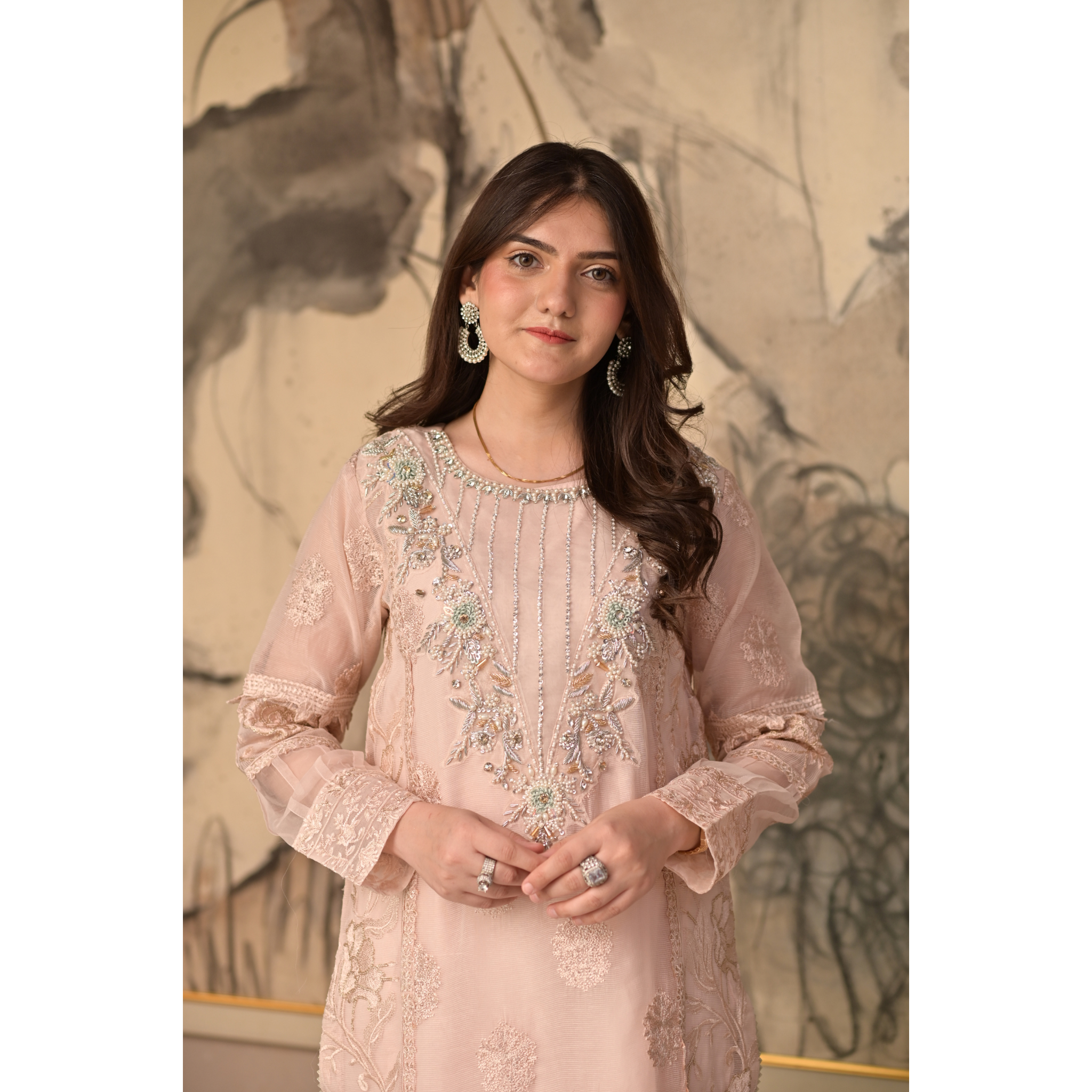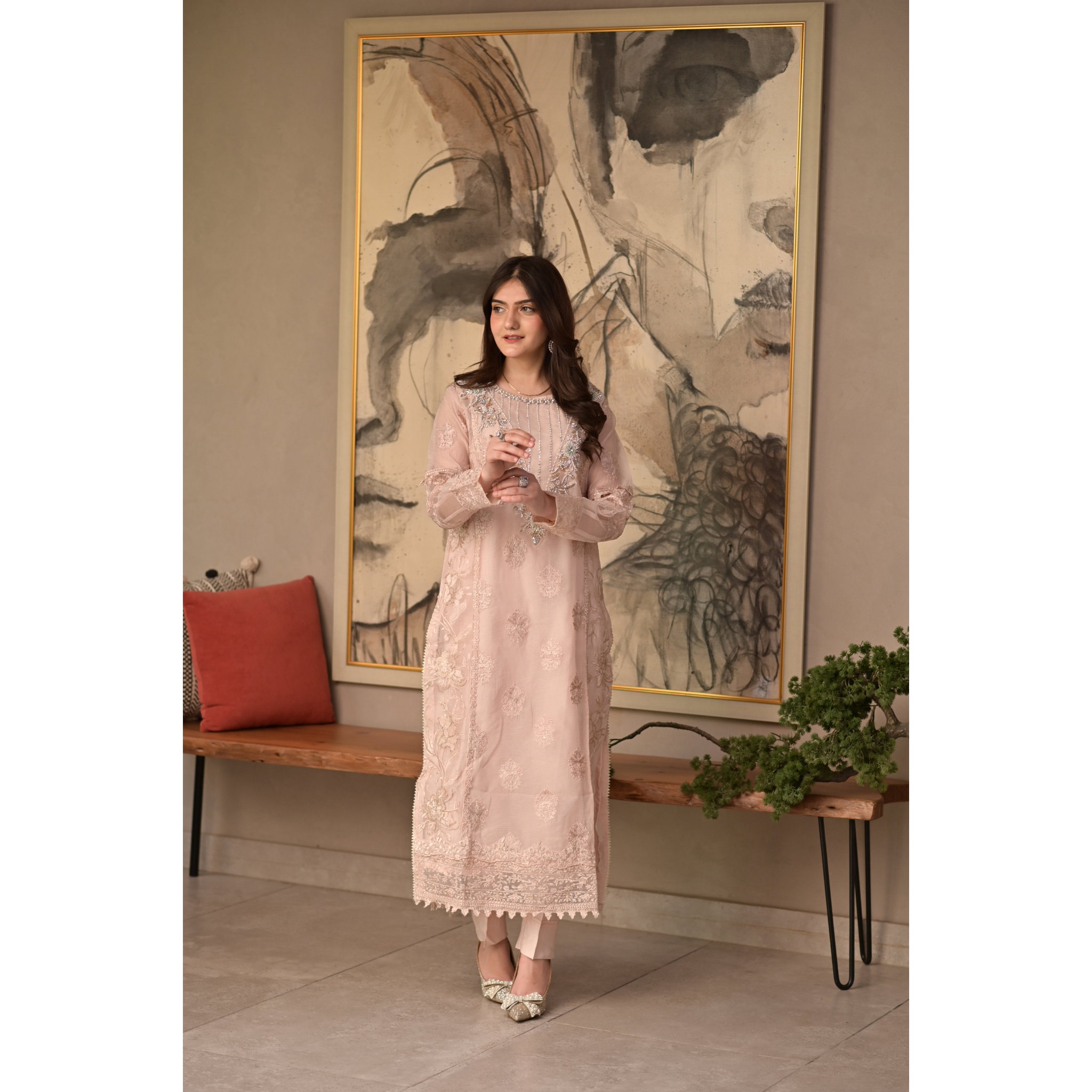 This stunning pink dress in luxurious Khaddi Net exudes timeless elegance. The V-styled neckline is luxuriously designed, while the daman features intricate lace detailing adorned with a beautiful arrangement of motifs, embellishments, sequins, fine thread work, and hand embroidery. The heavy embellishment throughout the dress elevates its charm, creating a regal aesthetic. Paired with a contrasting lilac trouser, this dreamy outfit offers sophisticated look. The sleeves are beautifully accented with square net lace, adding a touch of refinement. Perfect for formal gatherings and festive occasions, this dress combines intricate craftsmanship with exquisite details for a attention-grabbing charm.