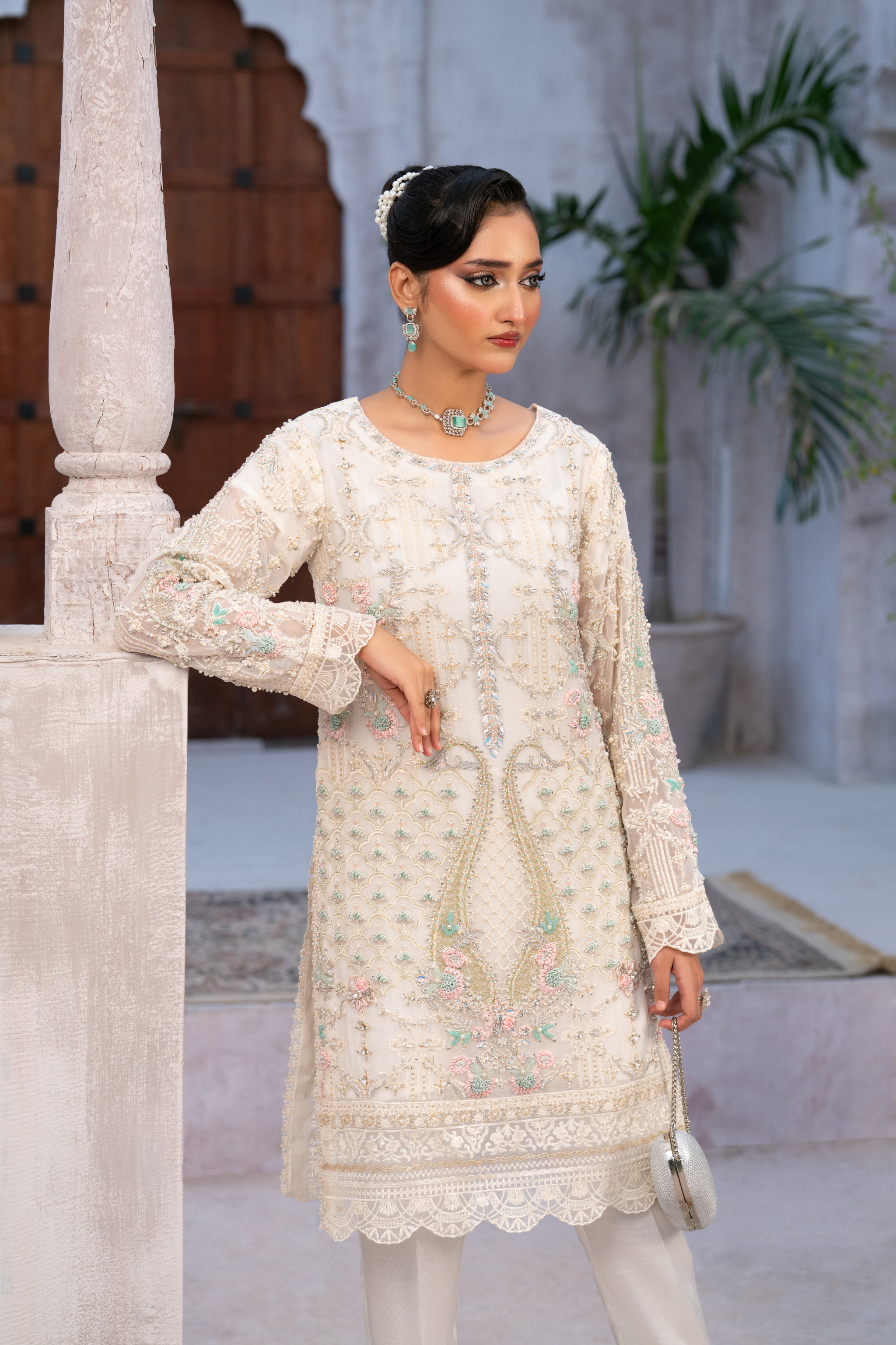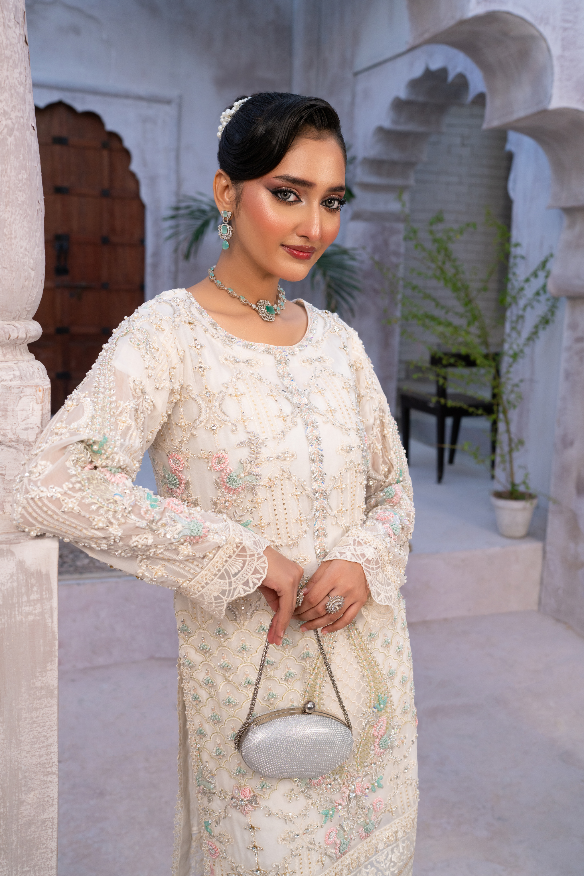 The round neckline and heavily adorned sleeves highlight exquisite craftsmanship. The shirt is beautifully embellished with intricate handwork, featuring kora dabka, stones, pearls, and pink & blue anchor thread embroidery that add depth, texture, and a subtle pop of color to the serene ivory base.