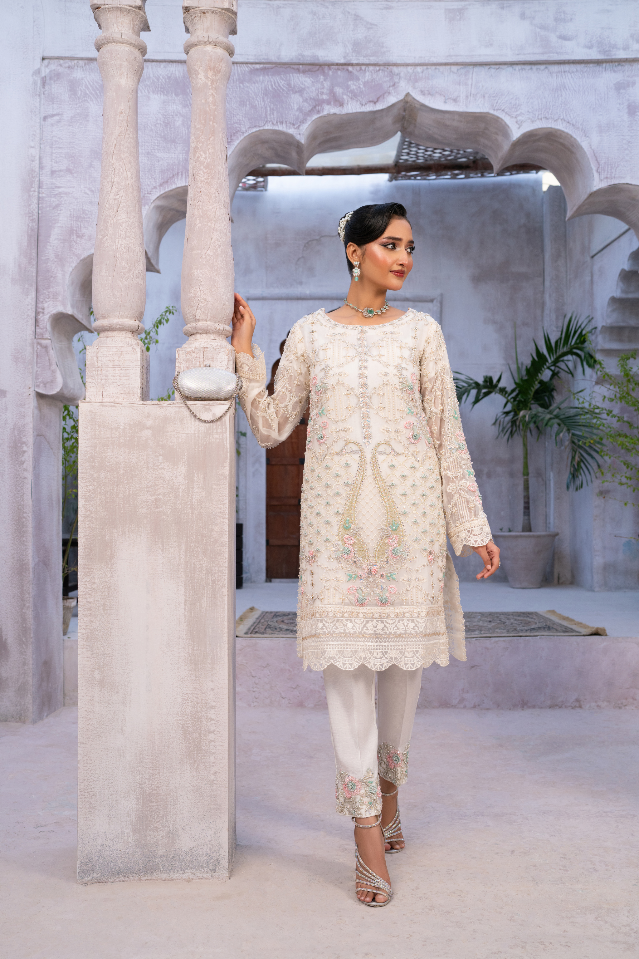 Step into elegance with this breathtaking ivory three-piece ensemble from our luxurious collection. The shirt and dupatta are crafted from premium chiffon fabric, exuding a soft, graceful flow that embodies timeless sophistication. Paired with raw silk trousers, the outfit perfectly balances luxury and comfort.