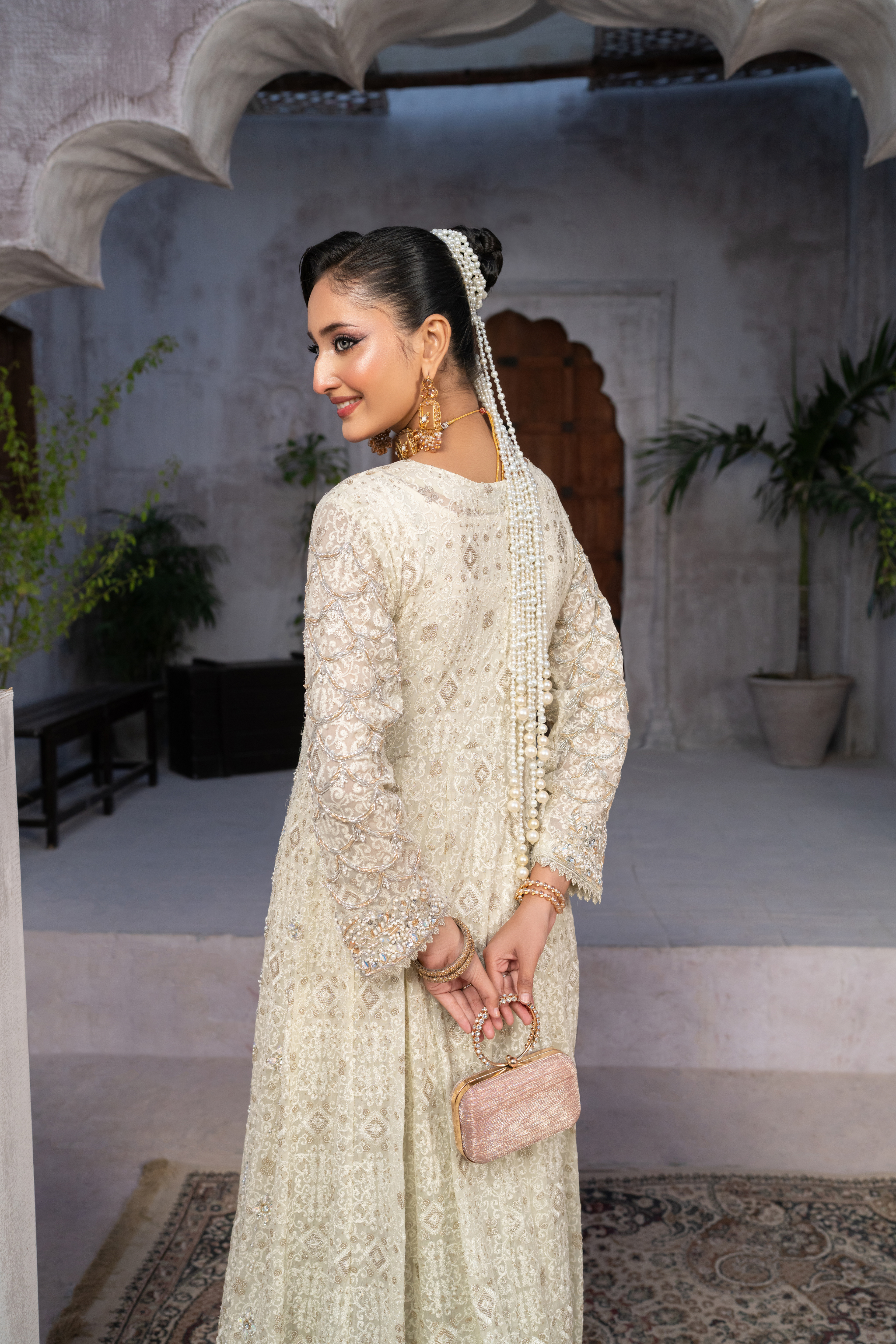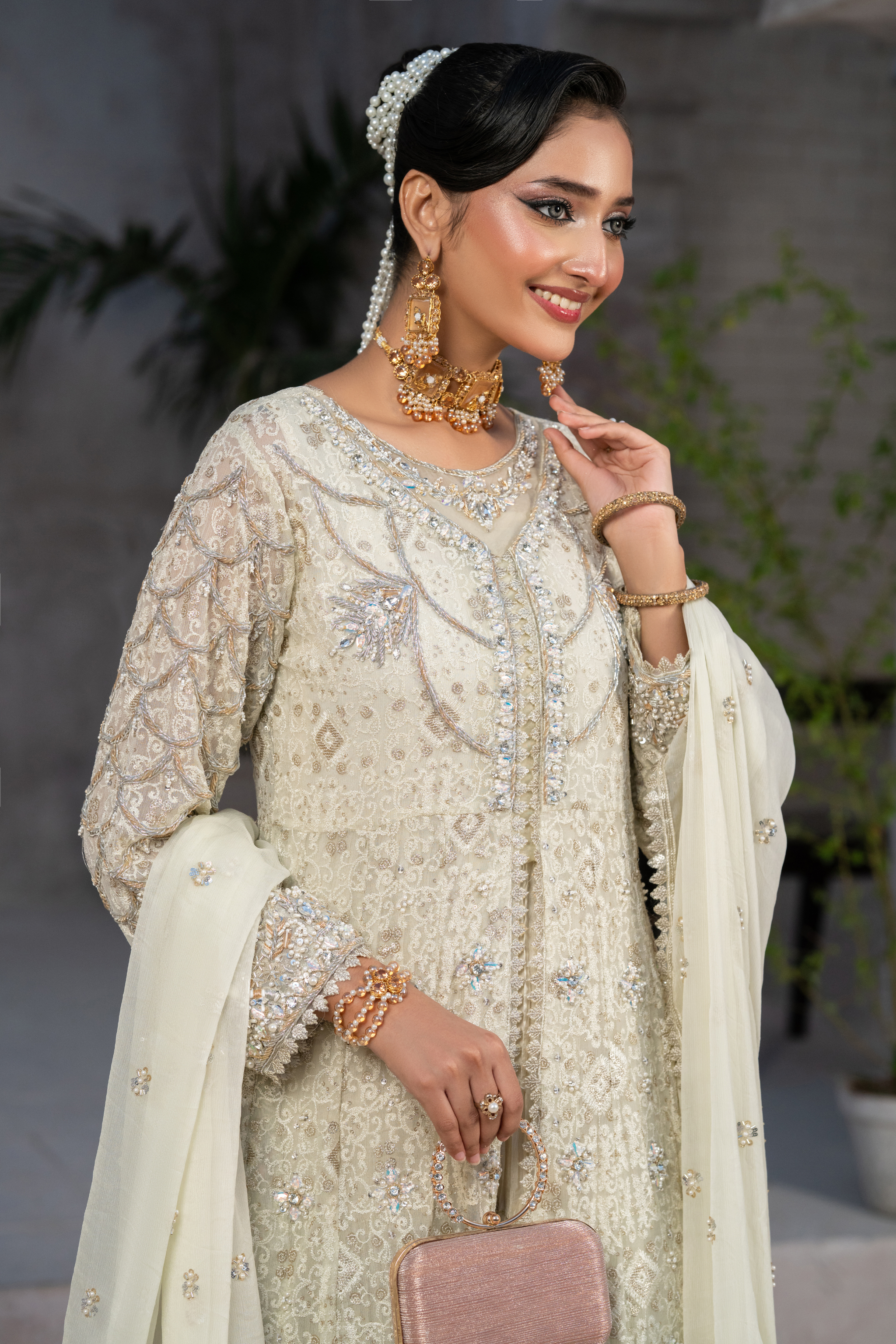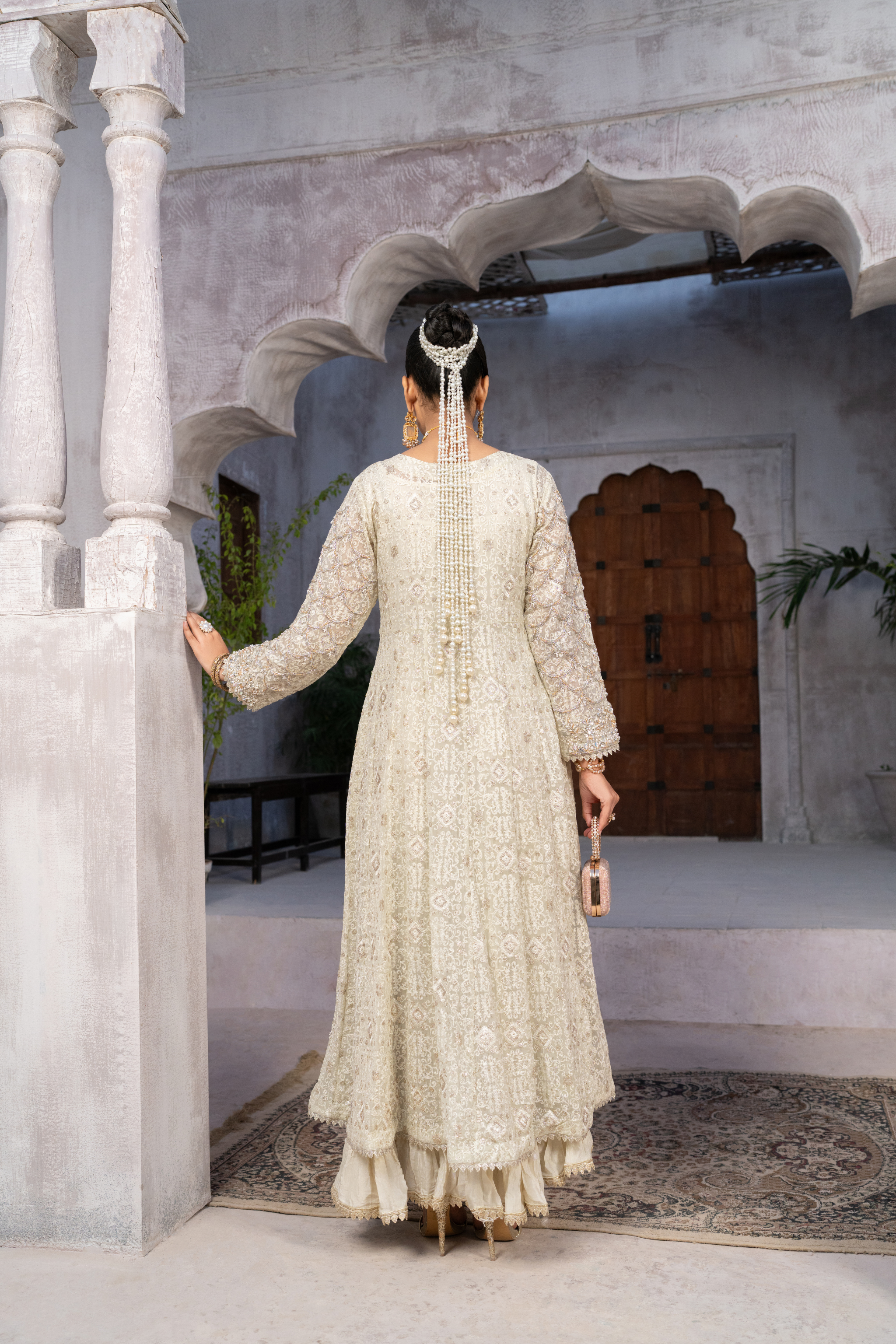 The neckline, delicately adorned with pure stones, beautifully frames the ensemble, while the fully embellished sleeves and motif detailing reflect an attention to perfection. Completing this regal attire is a raw silk trouser and a chiffon dupatta, gracefully crafted to enhance the gown’s ethereal charm.