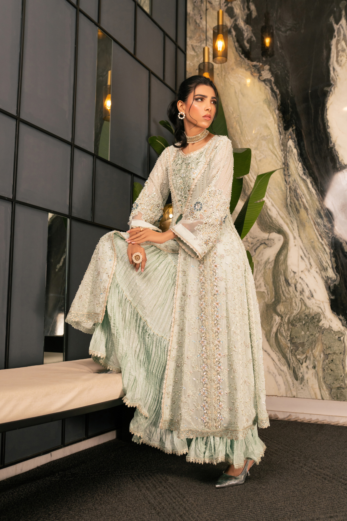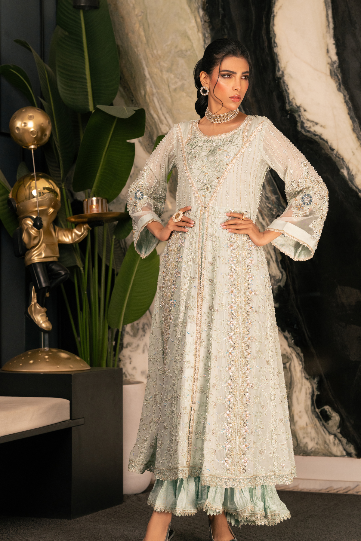 The neckline, delicately adorned with pure stones, beautifully frames the ensemble, while the fully embellished sleeves and motif detailing reflect an attention to perfection. Completing this regal attire is a raw silk trouser and a chiffon dupatta, gracefully crafted to enhance the gown’s ethereal charm.