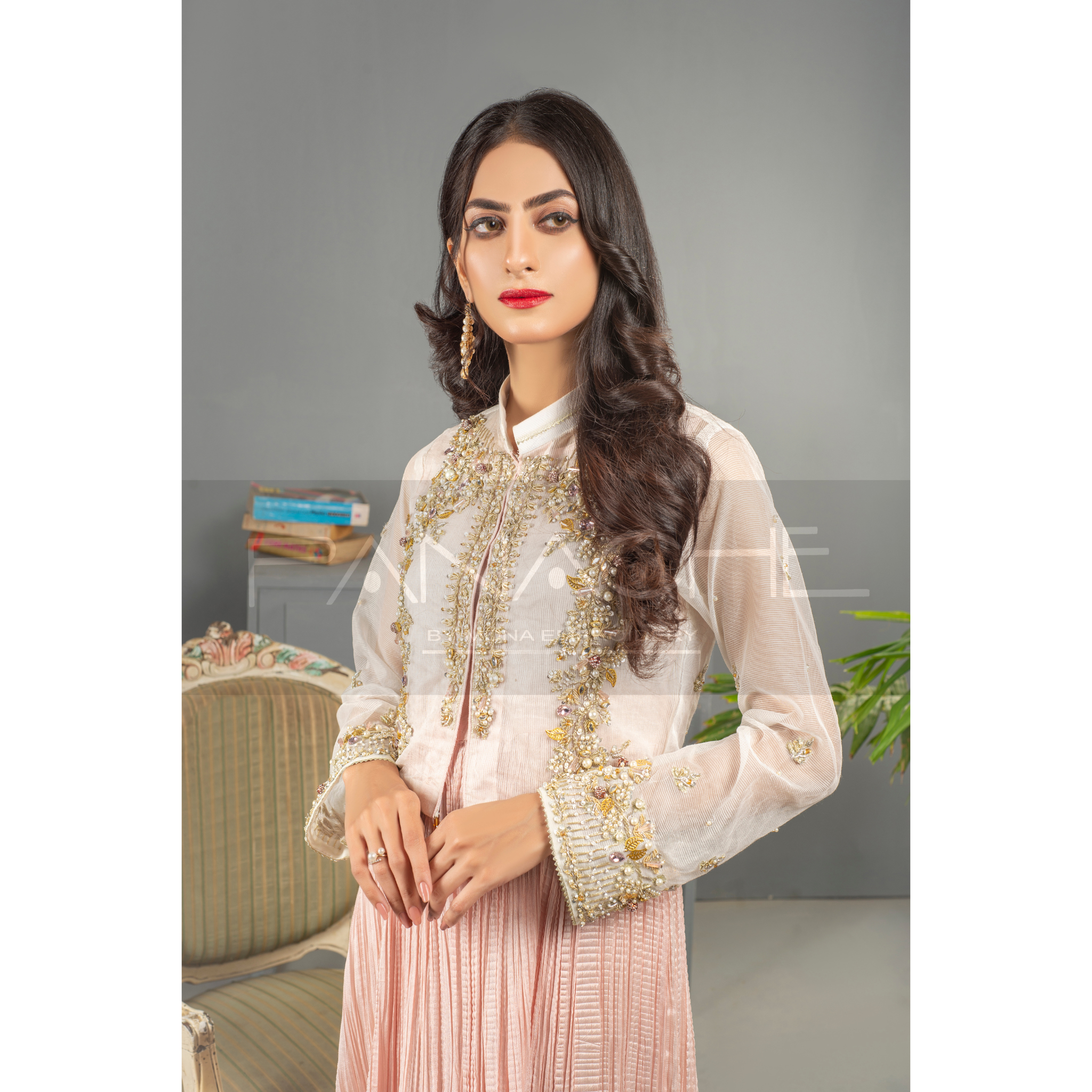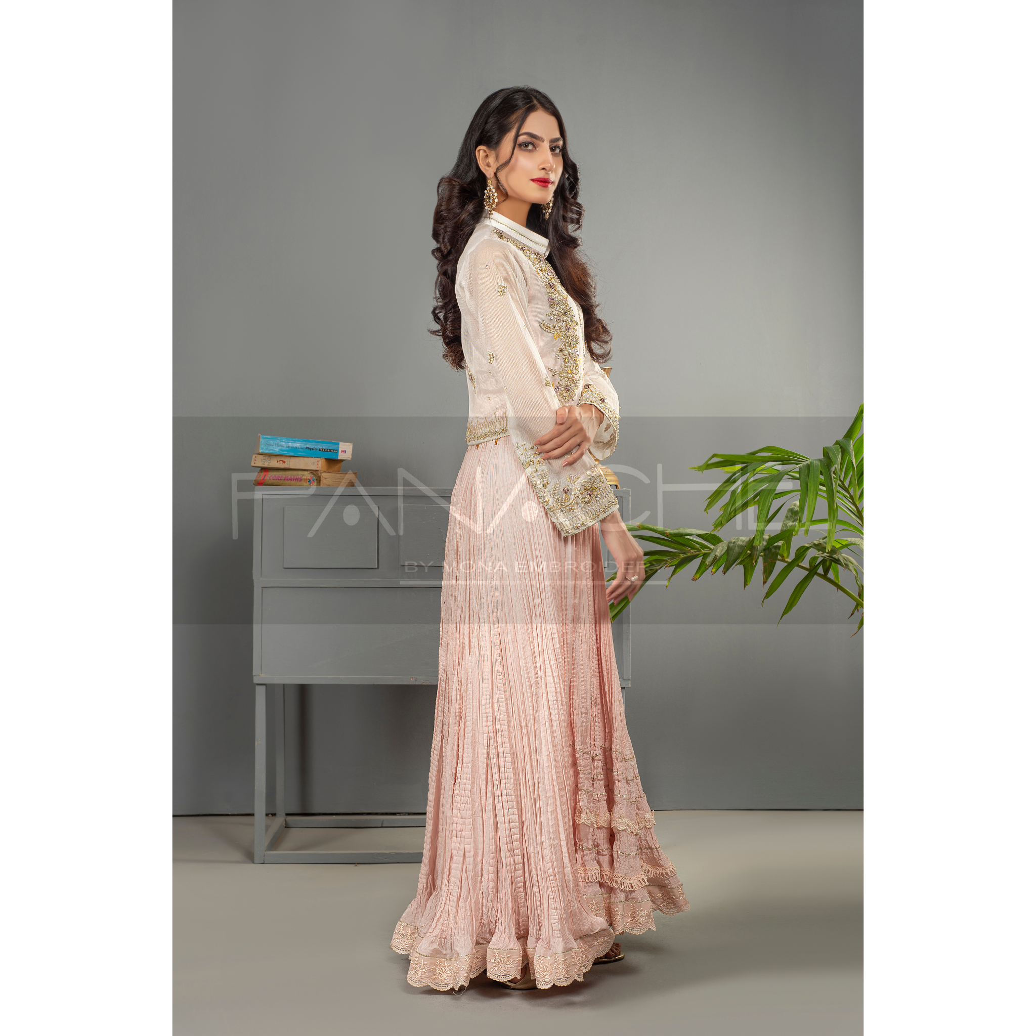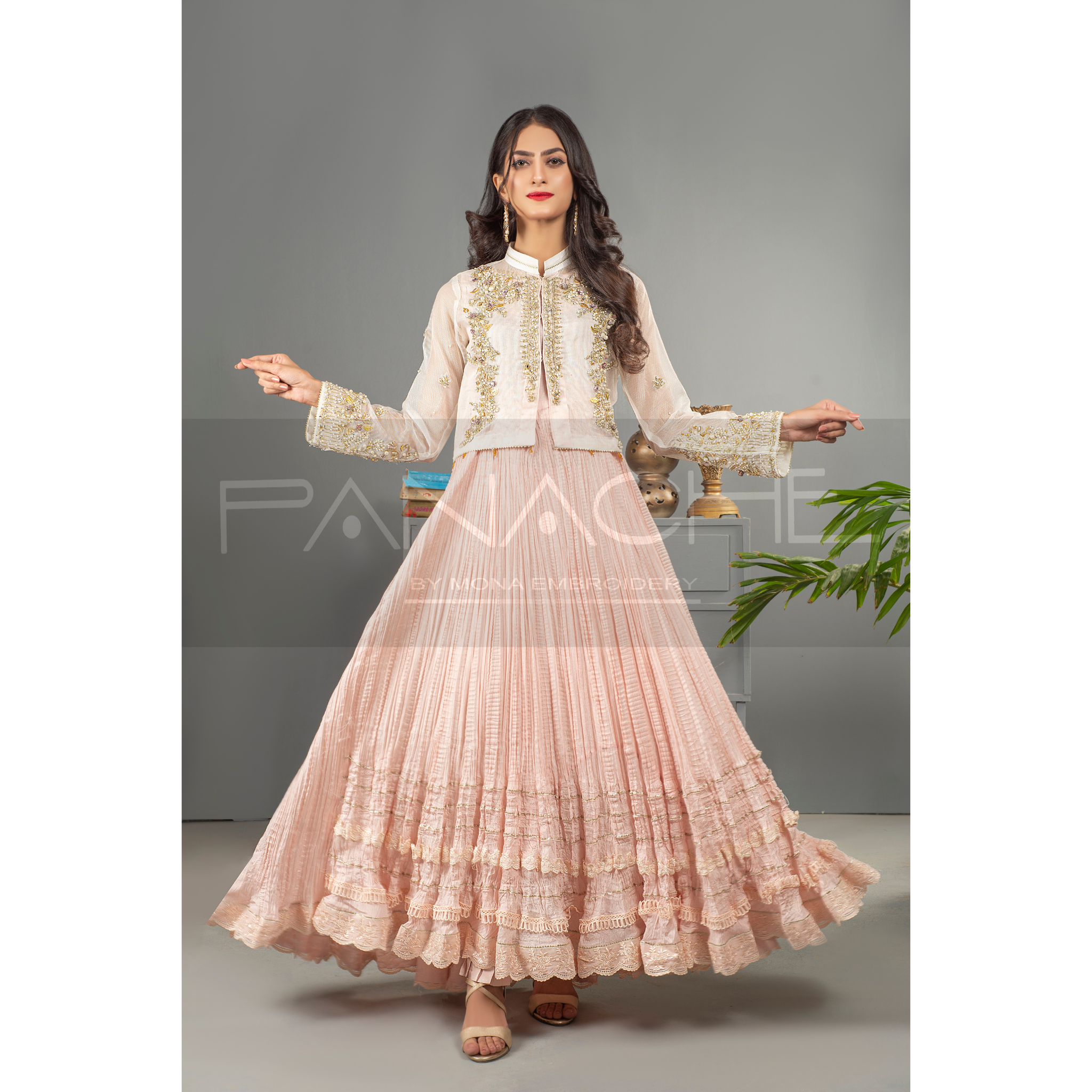 An exquisite look in a soft pink hue — This long maxi frock is fashioned from crush with a variety of laces to adorn its daman. The show stealer though is its hand embroidered jacket. Tailored to perfection in pure organza & embellished with intricate ornaments, it is beyond gorgeous!